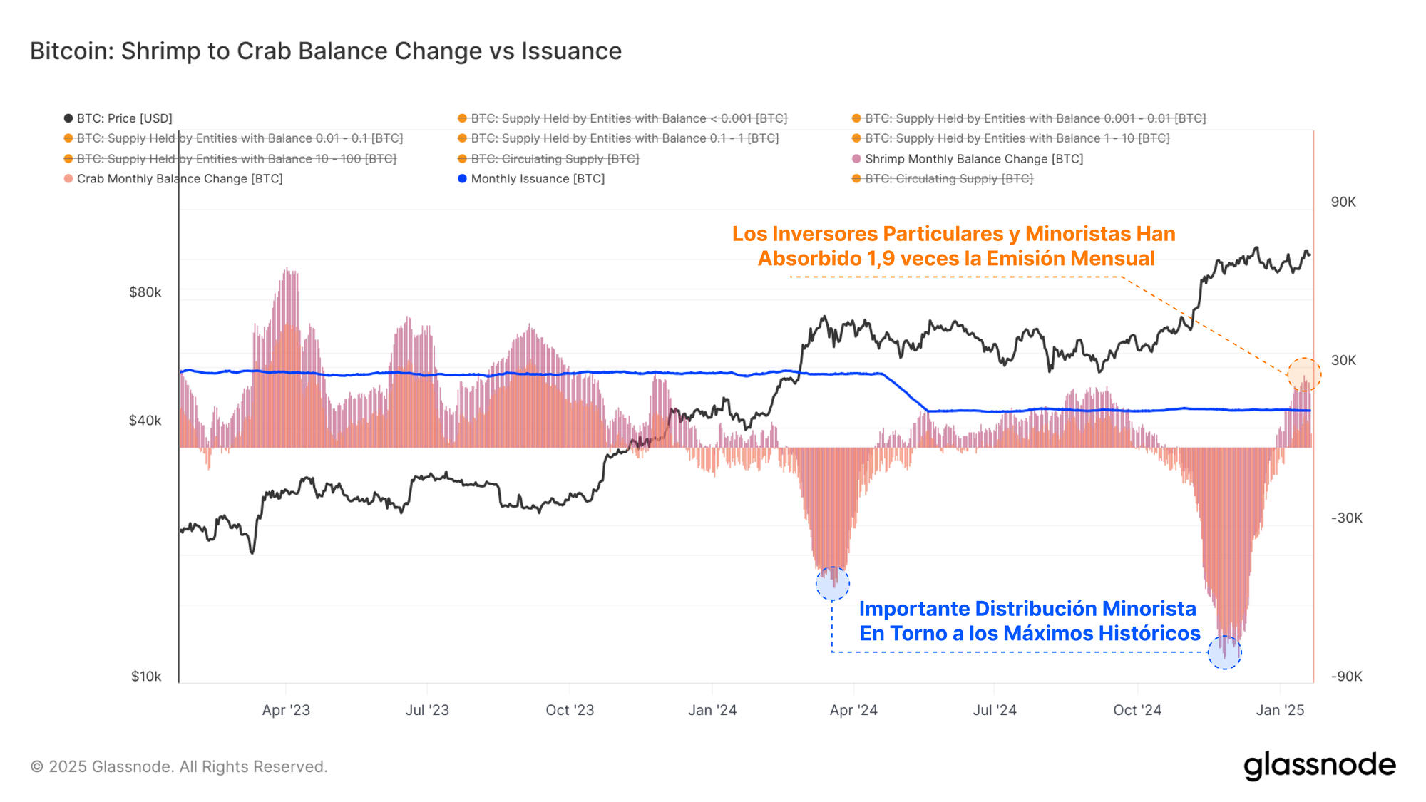 Enfocándonos en en conjunto de los Camarones-Cangrejos (que poseen menos de 10 BTC) como indicador de los inversores particulares y minoristas, observamos que este grupo ha absorbido aproximadamente +25.600 BTC sólo durante el último mes. Esto contrasta con una emisión mensual de alrededor de los +13.600 BTC que han generado los mineros.