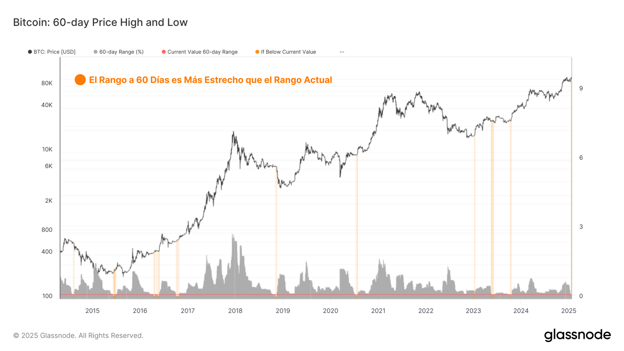 Al medir el porcentaje de variación entre los precios más altos y más bajos en los últimos 60 días, podemos visualizar el grado de compresión o volatilidad del mercado a lo largo del tiempo. La gráfica a continuación destaca periodos en los que el rango de precios de 60 días ha sido más estrecho que el rango actual. Todos estos casos precedieron explosiones significativas de volatilidad, la mayoría ocurriendo al inicio de los mercados alcistas o antes de las capitulaciones tardías dentro de los ciclos bajistas.