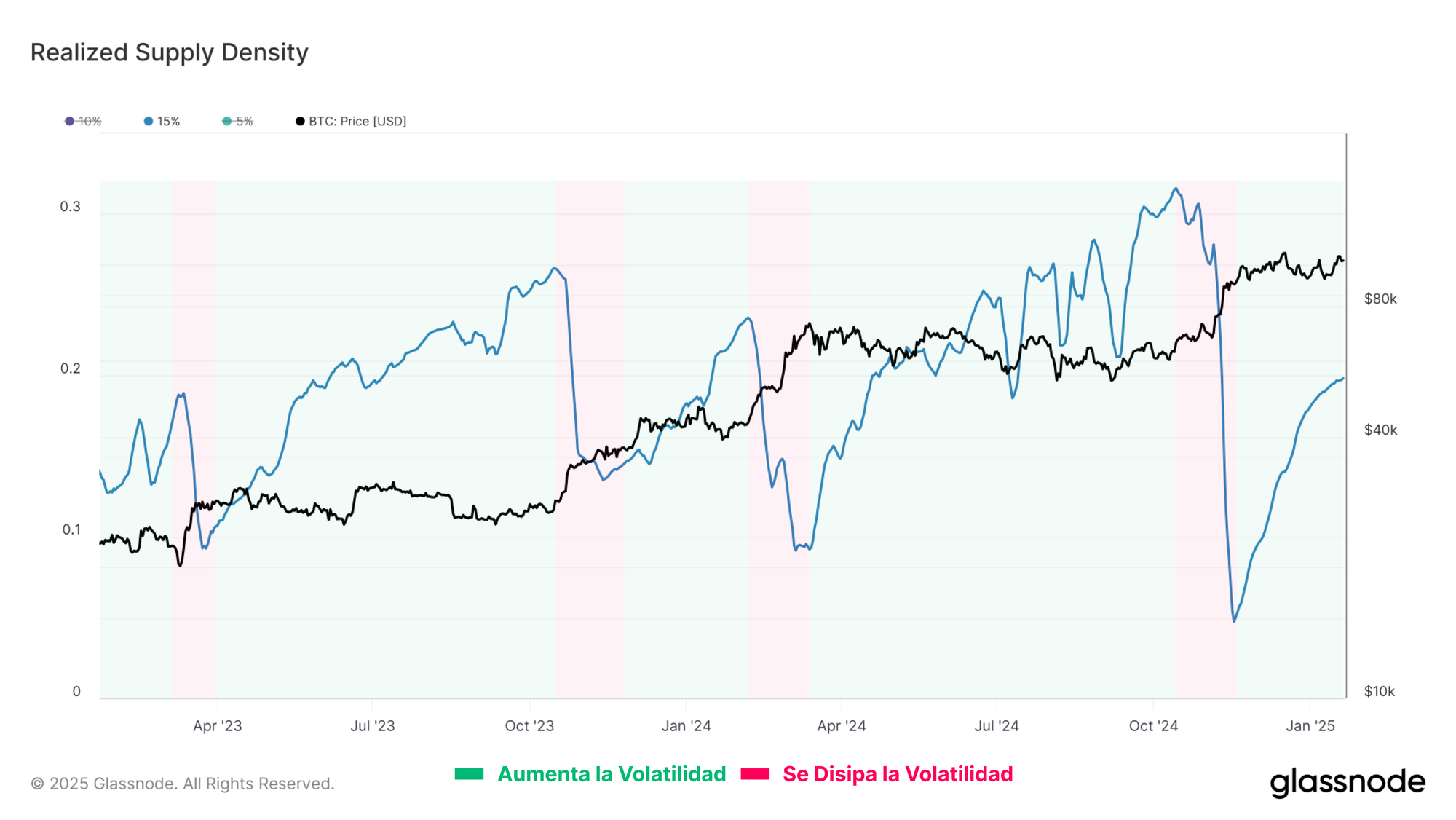 La métrica de la Densidad de la Oferta Realizada cuantifica la concentración de oferta alrededor del precio spot actual dentro de un rango de ±15%. Cuando la oferta se concentra significativamente cerca del precio spot, los movimientos más pequeños del precio pueden tener un impacto considerable sobre la rentabilidad de los distintos inversores, lo que, a su vez, puede amplificar la volatilidad del mercado.