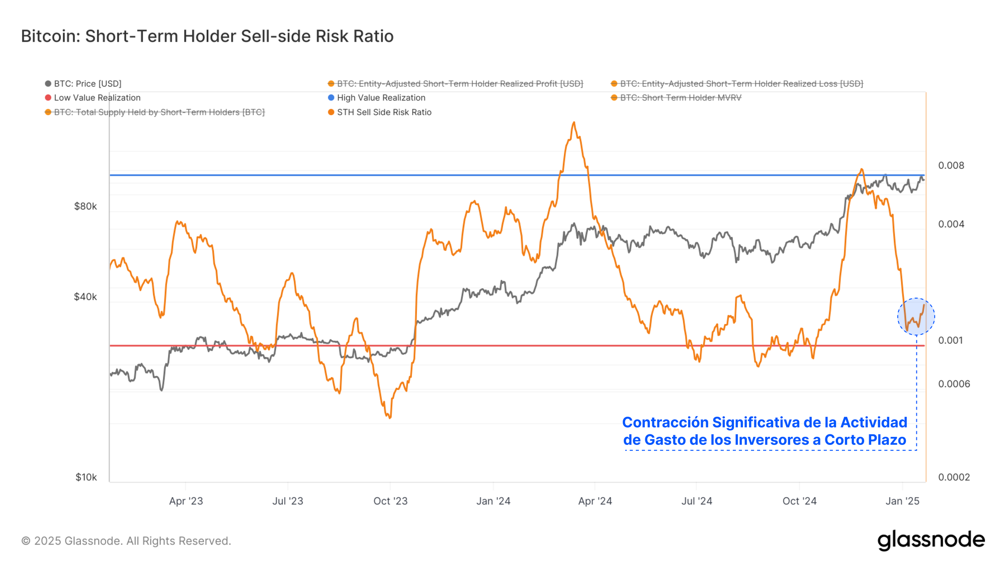 El Ratio de Riesgo de Venta analiza este fenómeno desde una perspectiva distinta. Esta métrica evalúa el volumen total de ganancias y pérdidas realizadas por los inversores en relación con el tamaño del activo, medido a través de la Capitalización Realizada. Se puede interpretar bajo el siguiente marco: