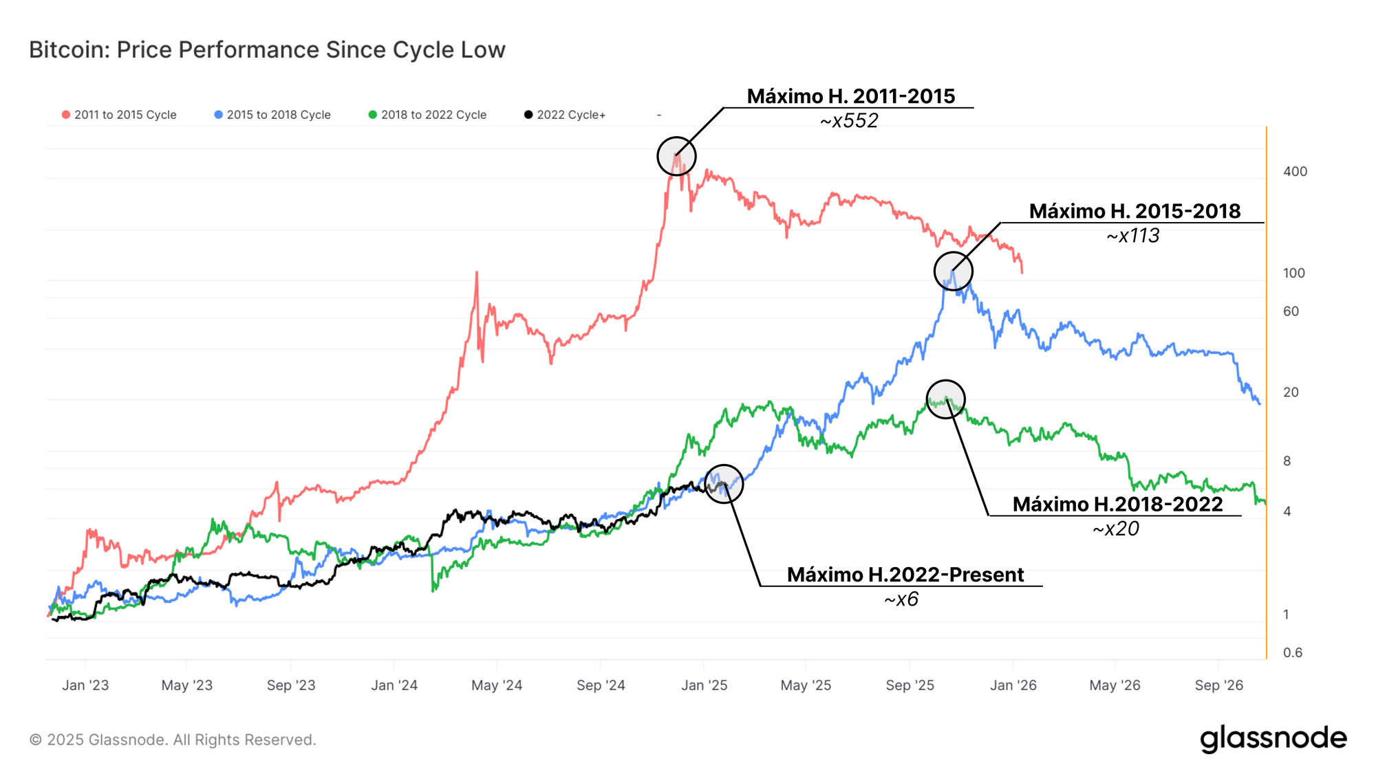 La posición actual del ciclo 2023-2025 con respecto al mínimo establecido a finales del 2022 sugiere que podríamos estar en plena transición hacia la segunda fase eufórica. En los dos ciclos anteriores, este momento ha estado marcado por una fuerte aceleración ascendente del precio, impulsada por una nueva oleada de demanda y un mayor interés en el activo.