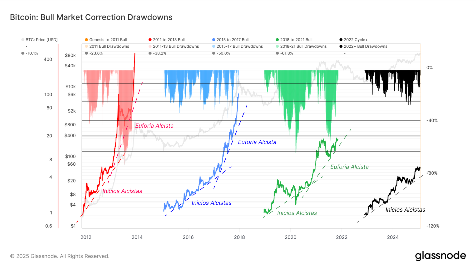 No obstante, podemos profundizar en este análisis observando el perfil de retroceso durante las tendencias alcistas. Lo que destaca es el notable paralelismo en los patrones de corrección desde que se estableció el mínimo tras el colapso de FTX. A pesar de que Bitcoin opera con una capitalización de mercado considerablemente mayor, los retrocesos típicos desde los máximos locales rara vez han superado el -25 %.
