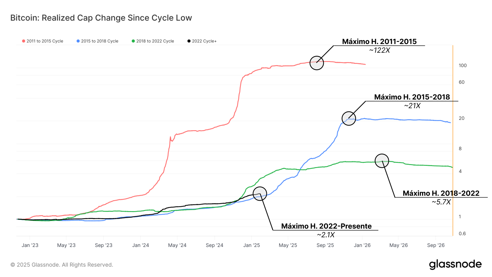Durante el ciclo 2011-2015, la Capitalización Realizada creció en un asombroso ~x122, impulsada por la adopción exponencial de Bitcoin en sus primeros años. Sin embargo, a medida que el mercado ha madurado, estas tasas de crecimiento han ido disminuyendo en cada ciclo posterior, reflejando la transición que Bitcoin ha atravesado hasta convertirse en un mercado estructuralmente más consolidado y con mayores requerimientos de capital.