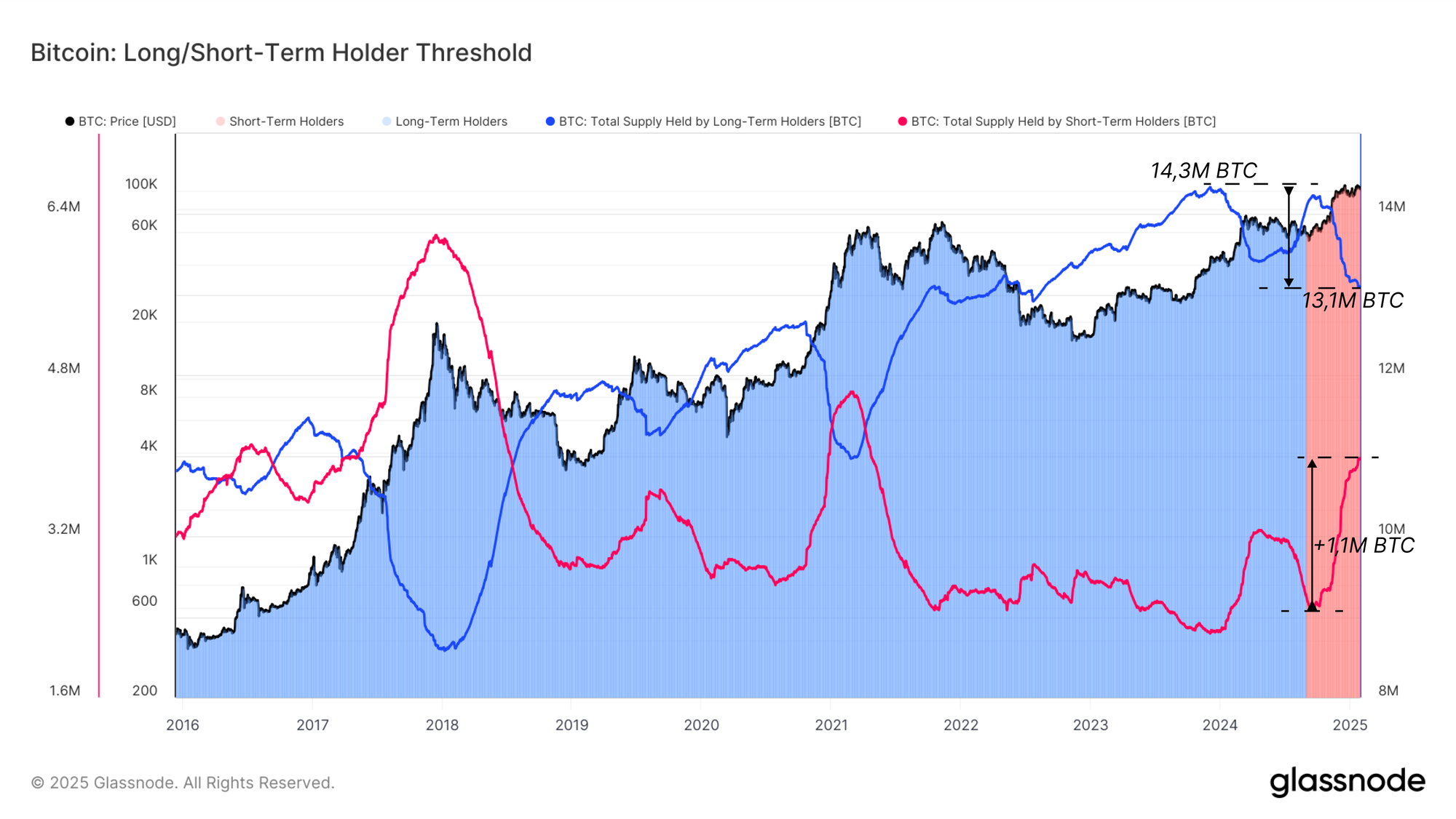La siguiente gráfica ilustra esta rotación de capital en los ciclos de mercado previos, donde encontramos que 1,2M BTC han cambiado de manos desde el máximo histórico de la Oferta de los ILP de 14,3M BTC en diciembre del 2023. En el reciente impulso alcista por encima de los 100.000$, se han transferido 1,1M BTC de las carteras de los inversores a largo plazo a las manos de los inversores a corto plazo, prueba de que existe una impresionante entrada de demanda capaz de absorber esta oferta incluso en niveles superiores a los 90.000$.