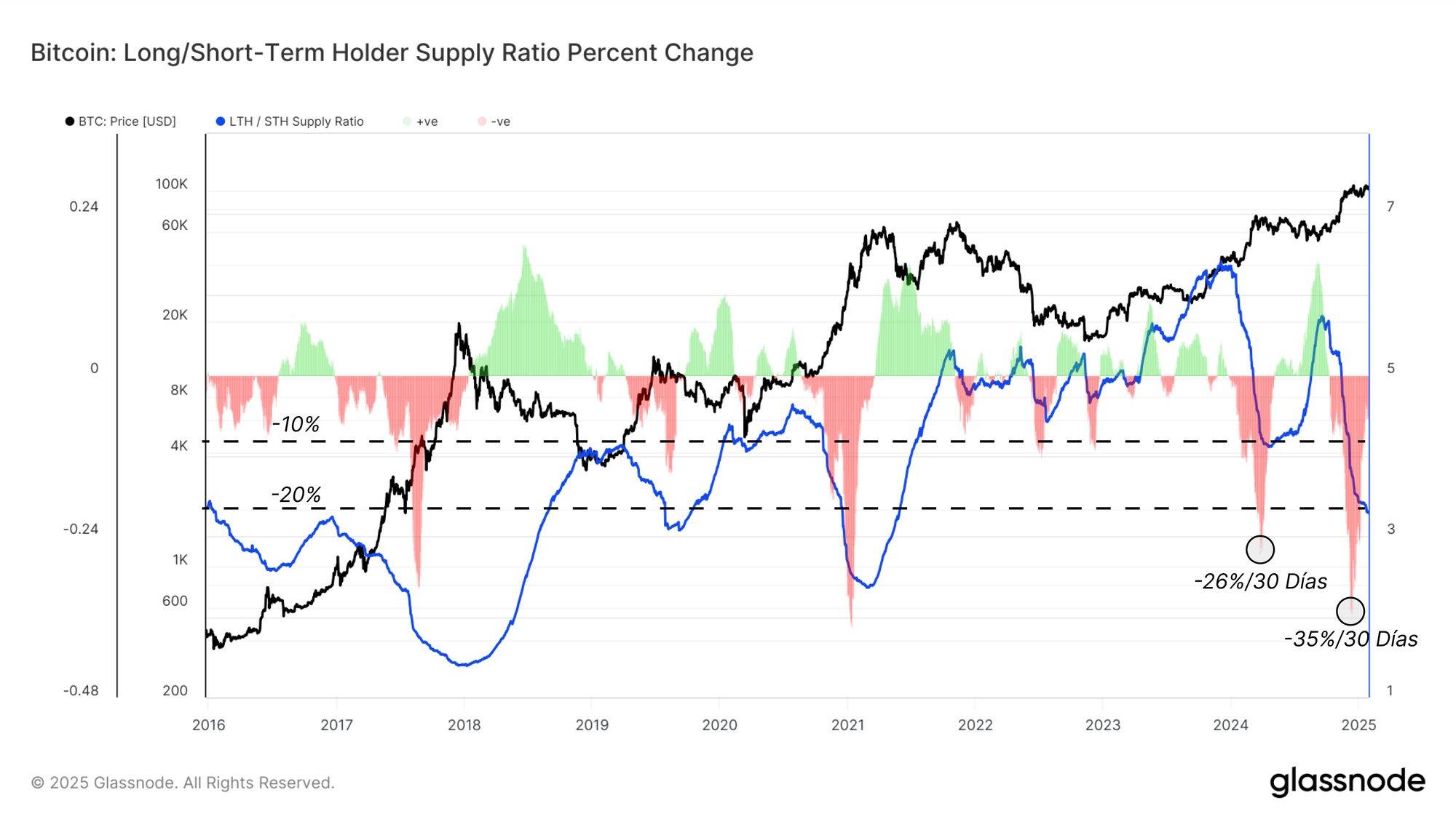 El ritmo mensual de cambio en este ratio resalta dos grandes oleadas de distribución que han ocurrido dentro del ciclo 2023-2025, comparables en magnitud a las de principios del 2021 y finales del 2017.