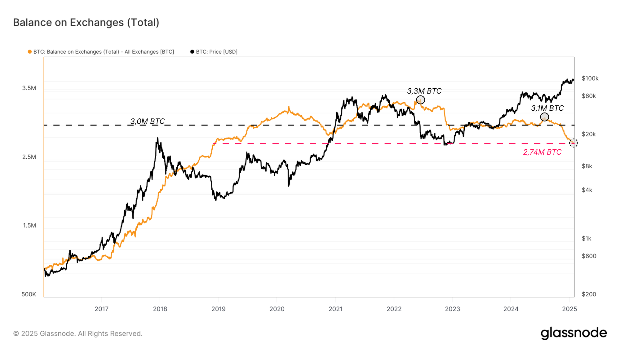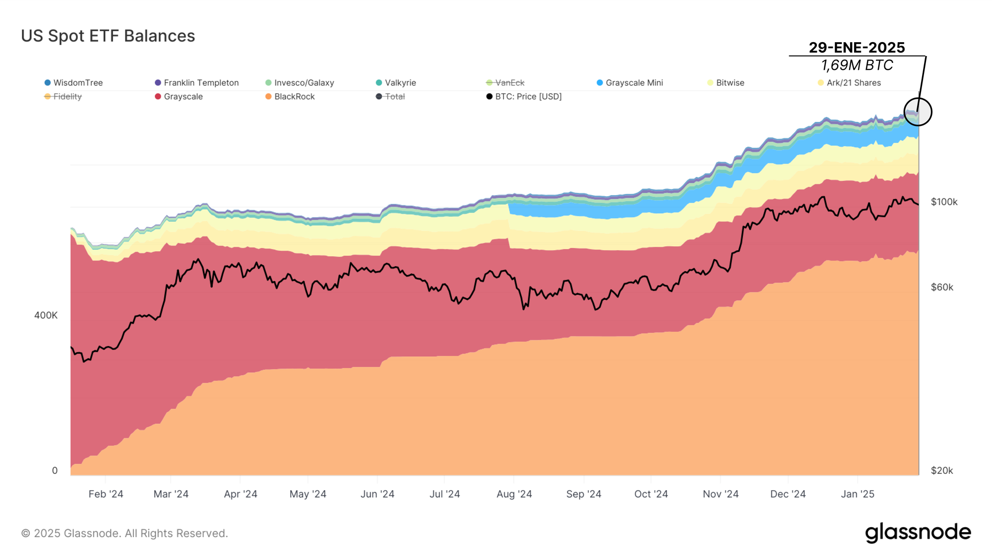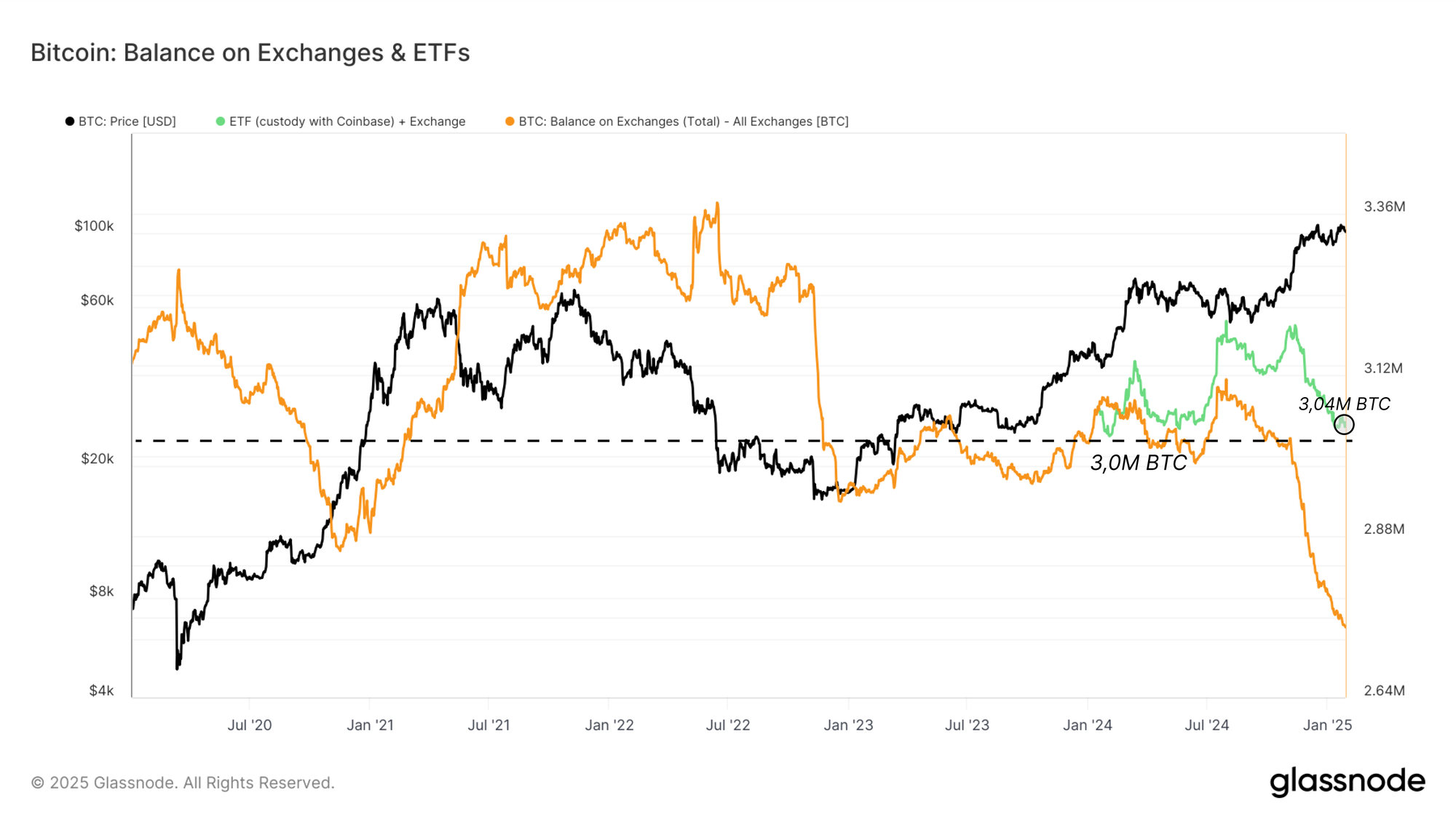 Teniendo en cuenta el crecimiento neto de los AUM de estos ETFs desde su lanzamiento, el balance combinado en los exchanges y en las carteras de los ETF ha oscilado en torno a los 3M BTC, el mismo nivel que los exchanges mantenían en enero del 2024.