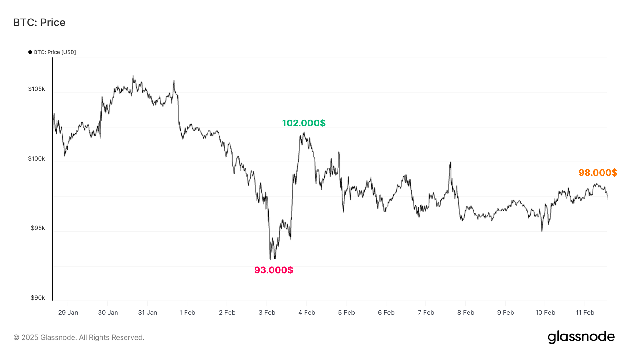 La semana pasada, los inversores de Bitcoin vivieron un intenso vaivén en la acción del precio. BTC cayó inicialmente hasta los 93.000$, consiguió recuperarse brevemente hasta los 102.000$, y actualmente cotiza cerca de los 98.000$. Esta indecisa acción de precio responde, en gran parte, a la amenaza del presidente Trump de imponer aranceles a Canadá, México y China, lo que agrega un trasfondo macroeconómico incierto para todo tipo de inversores. A esto se le suma la persistente fortaleza del dólar estadounidense, que está contribuyendo a generar un entorno de liquidez con más tensión de lo habitual.
