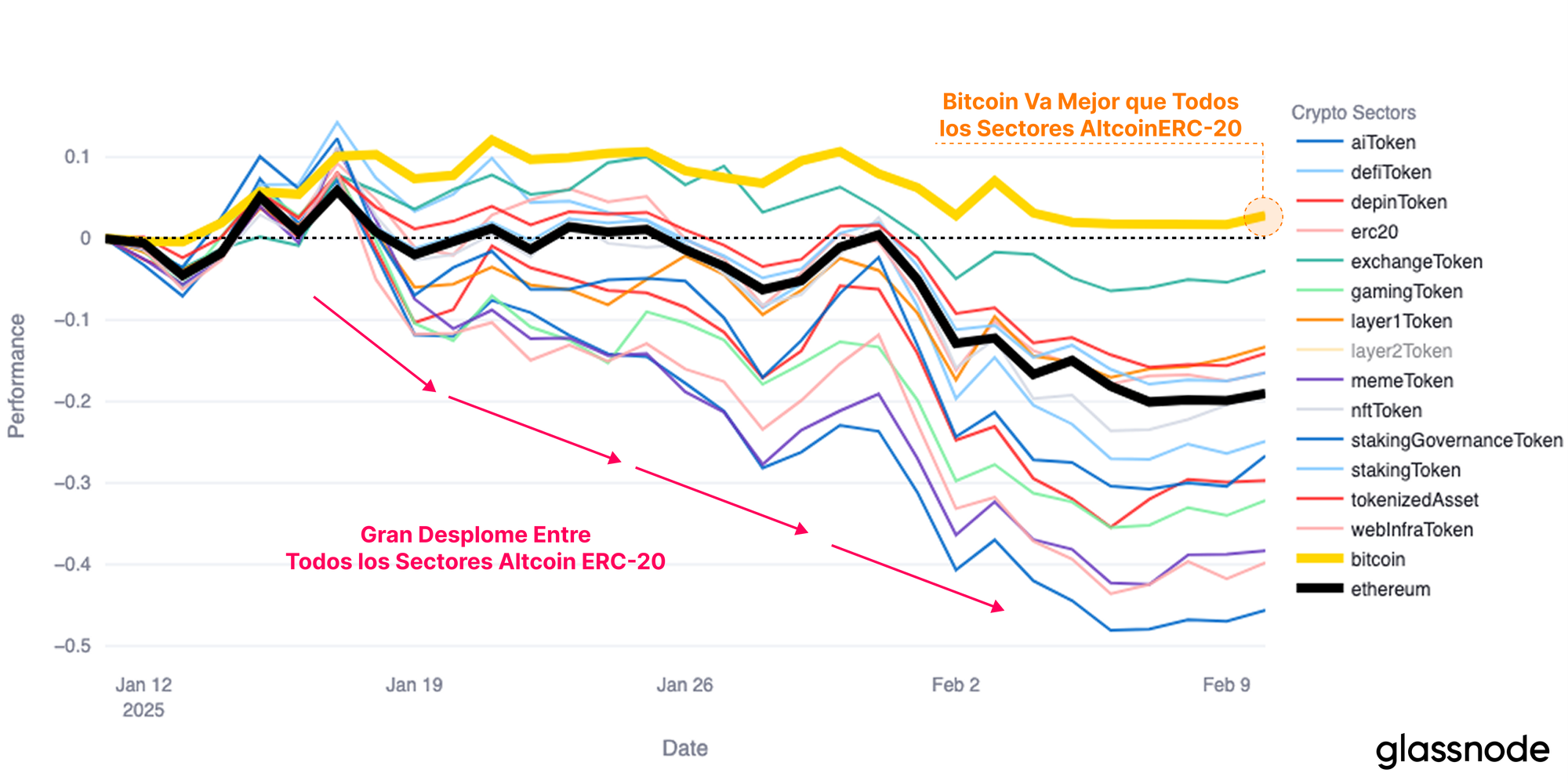 Por otro lado, el sector de las Altcoins ha experimentado una presión de venta muy intensa, donde muchos activos luchan por alcanzar una adopción generalizada o por encontrar el sitio que les corresponde en el mercado. Esto ha desembocado en un colapso general del precio de los tokens, y todos los subsectores de las Altcoins están rindiendo por debajo de Bitcoin en las últimas semanas.