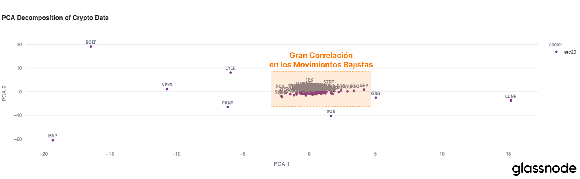 Para analizar la acción bajista del espacio Altcoin, podemos emplear un Análisis de Componentes Principales (PCA), una técnica que proyecta la correlación entre los rendimientos de los tokens en un espacio bidimensional. Es una visualización que nos permite identificar qué tokens tienden a comportarse de manera similar (agrupados) y cuáles se desmarcan con dinámicas distintas (separados).