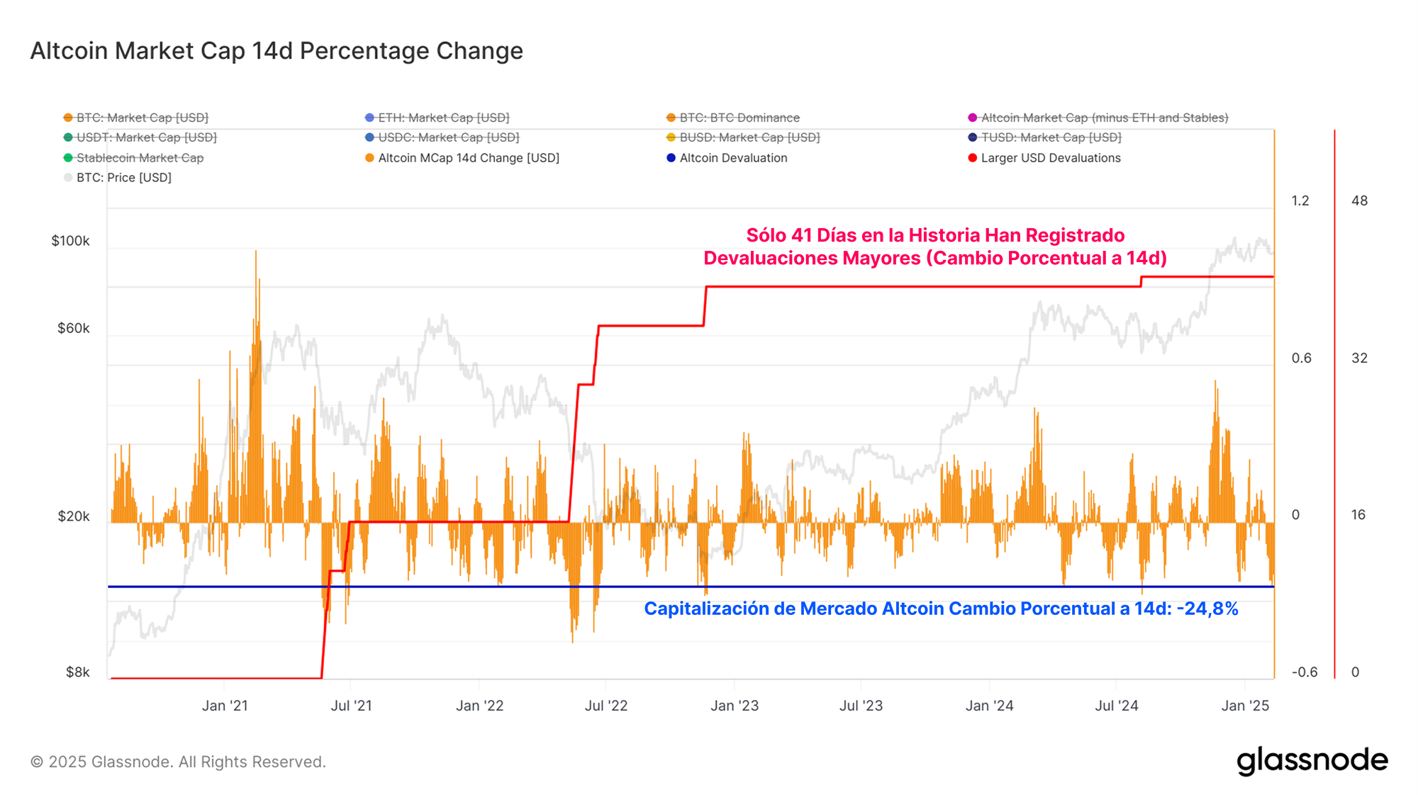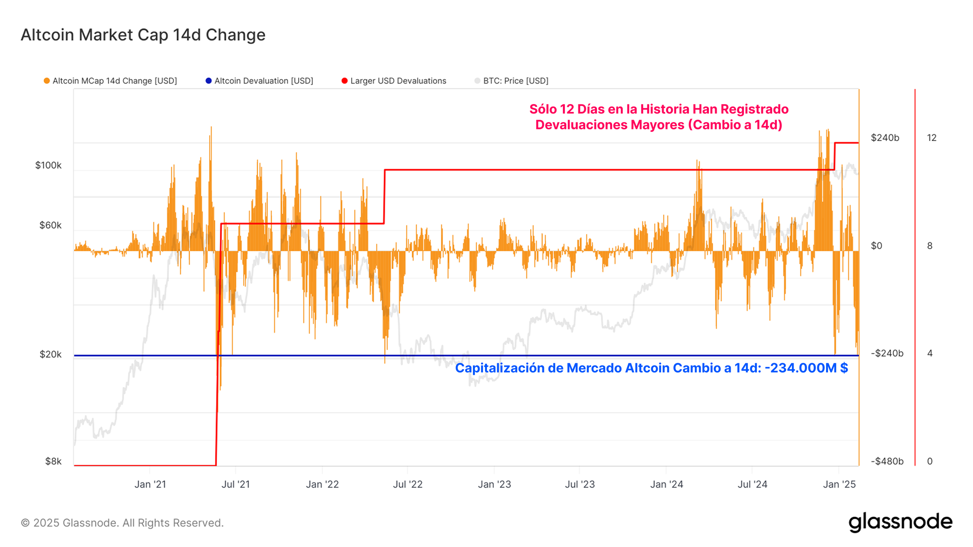 Podemos evaluar la magnitud de este desplome analizando el cambio en la capitalización global del mercado de las Altcoins a lo largo de los últimos 14 días. Durante este período, la capitalización de mercado de las Altcoins se redujo en 234.000M $, y sólo un puñado de días han registrando una caída absoluta de mayor envergadura.