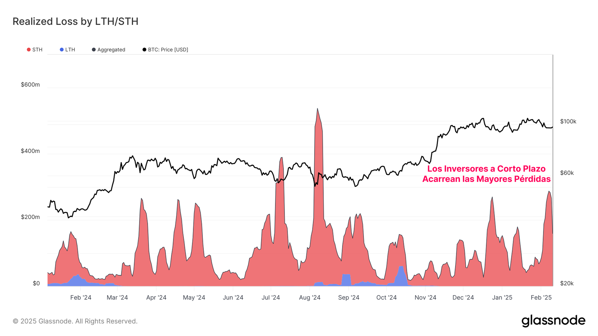 En un régimen de mercado alcista, los inversores a largo plazo suelen acumular beneficios considerables. Por ello, la fuente predominante de pérdidas realizadas proviene del grupo de los Inversores a Corto Plazo, ya que este conjunto de participantes engloba a los recién llegados al mercado, quienes generalmente tienen un coste base más elevado.