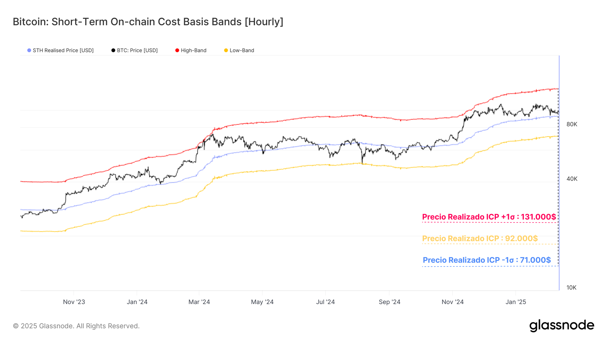 En estos momentos, el precio spot cotiza dentro del rango que delimitan las bandas superior e inferior, y se mantiene ligeramente por encima del coste base de los Inversores a Corto Plazo. Esto indica que el equipo alcista aún conserva el control, aunque el precio ya se acerca a las primeras líneas de defensa y casi ha puesto a prueba el coste base de los Inversores a Corto Plazo durante la oleada de ventas más reciente.