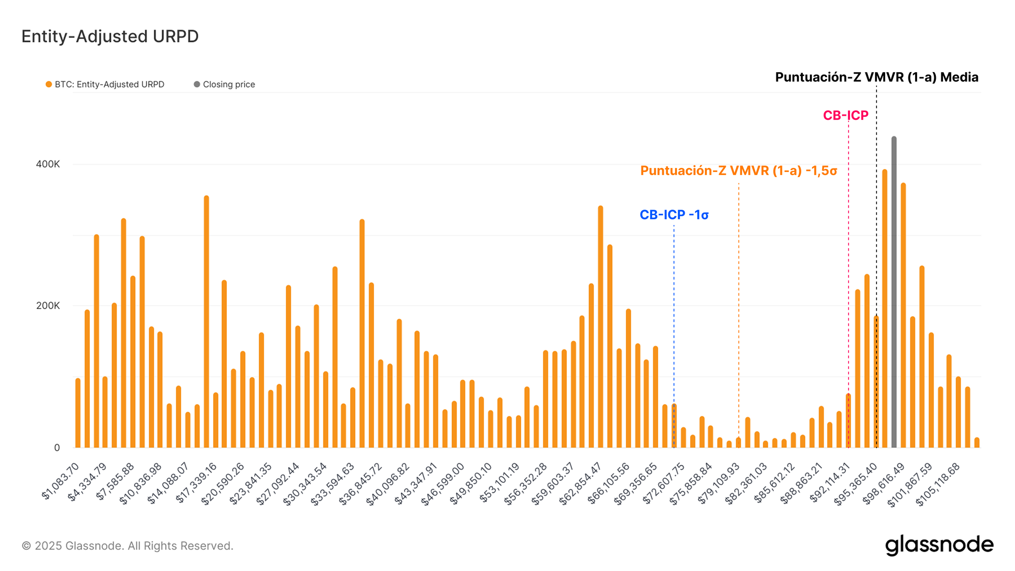 Además, la banda -1σ del coste base de los Inversores a Corto Plazo se encuentra en el límite superior de esta brecha de volumen, lo que sugiere que esta podría ser una zona de altísima sensibilidad en caso de que el precio caiga hasta allí.