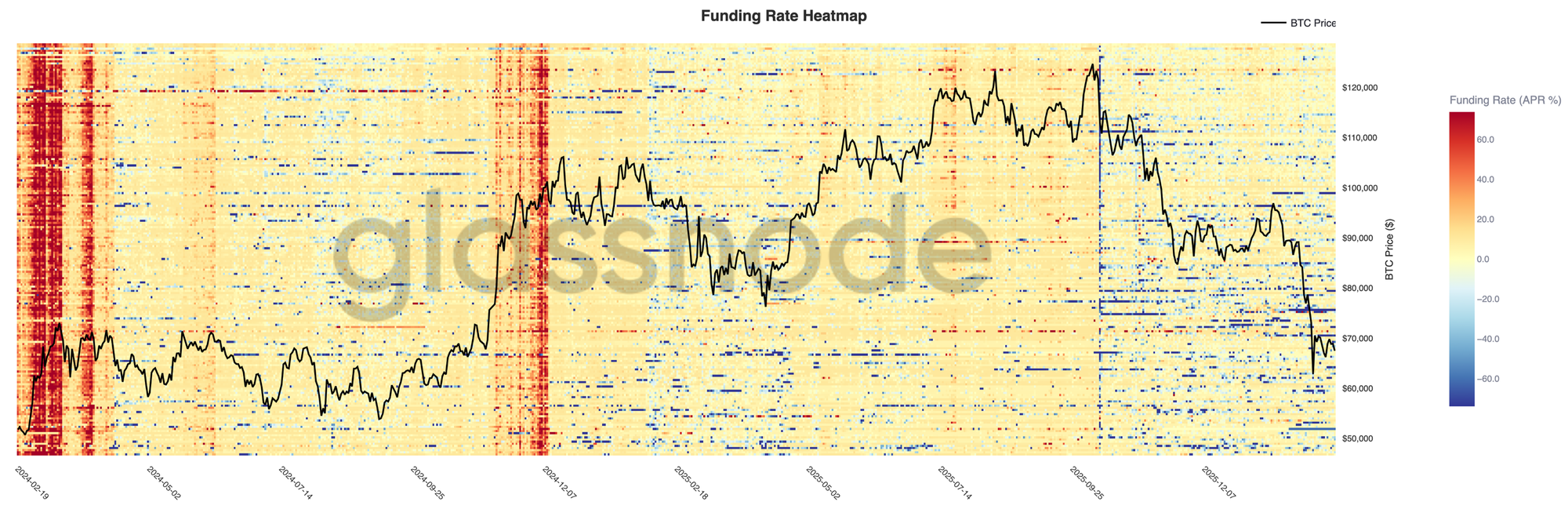 Las tasas de financiación en los contratos perpetuos se han comprimido con fuerza en los distintos exchanges. El mapa de calor muestra una transición clara: de tasas persistentemente positivas durante el avance hacia los 120.000$, hemos pasado a registros cada vez más neutrales e incluso negativos a medida que el precio retrocedía hacia los 70.000$. Este cambio refleja un desmantelamiento significativo del apalancamiento del las posiciones en largo.