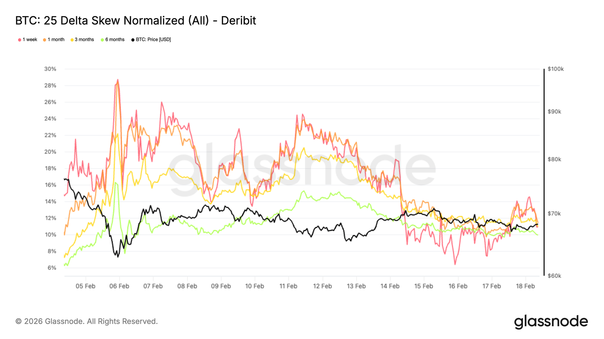 Tras el retesteo de la zona de los 60.000$, el skew se mantuvo cerca del 20%. Desde entonces, se ha relajado hasta aproximadamente el 11% en los distintos vencimientos, lo que supone una moderación de unos 9 puntos porcentuales en apenas unas pocas sesiones.