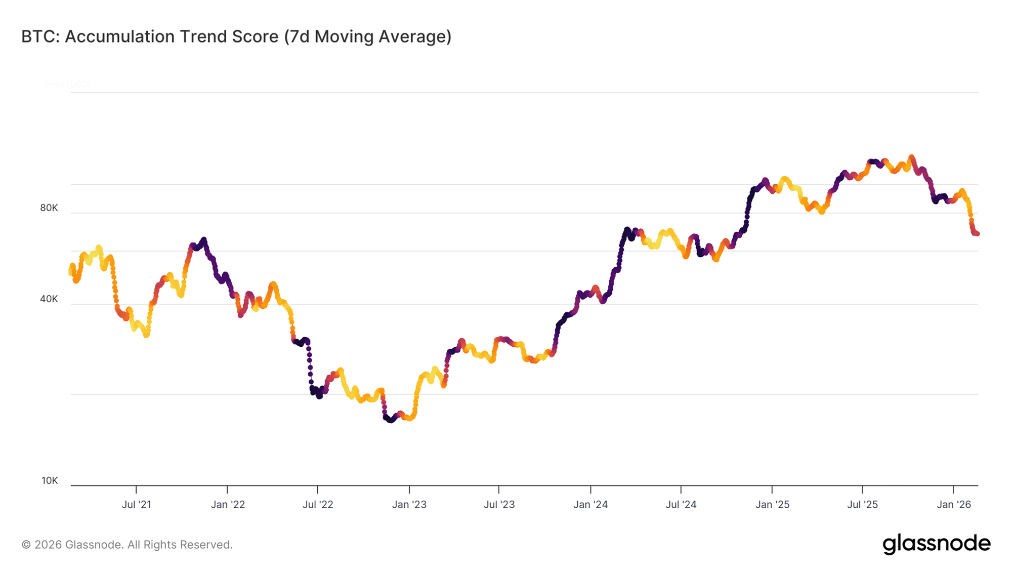 Bitcoin ha perforado por debajo de la Media Real del Mercado (~79.000$), adentrándose en un terreno más defensivo delimitado entre los 79.000$ y el Precio Realizado (~54.900$). Los flujos en el mercado spot y la demanda procedente de los ETF siguen mostrando debilidad y la acumulación se tambalea.