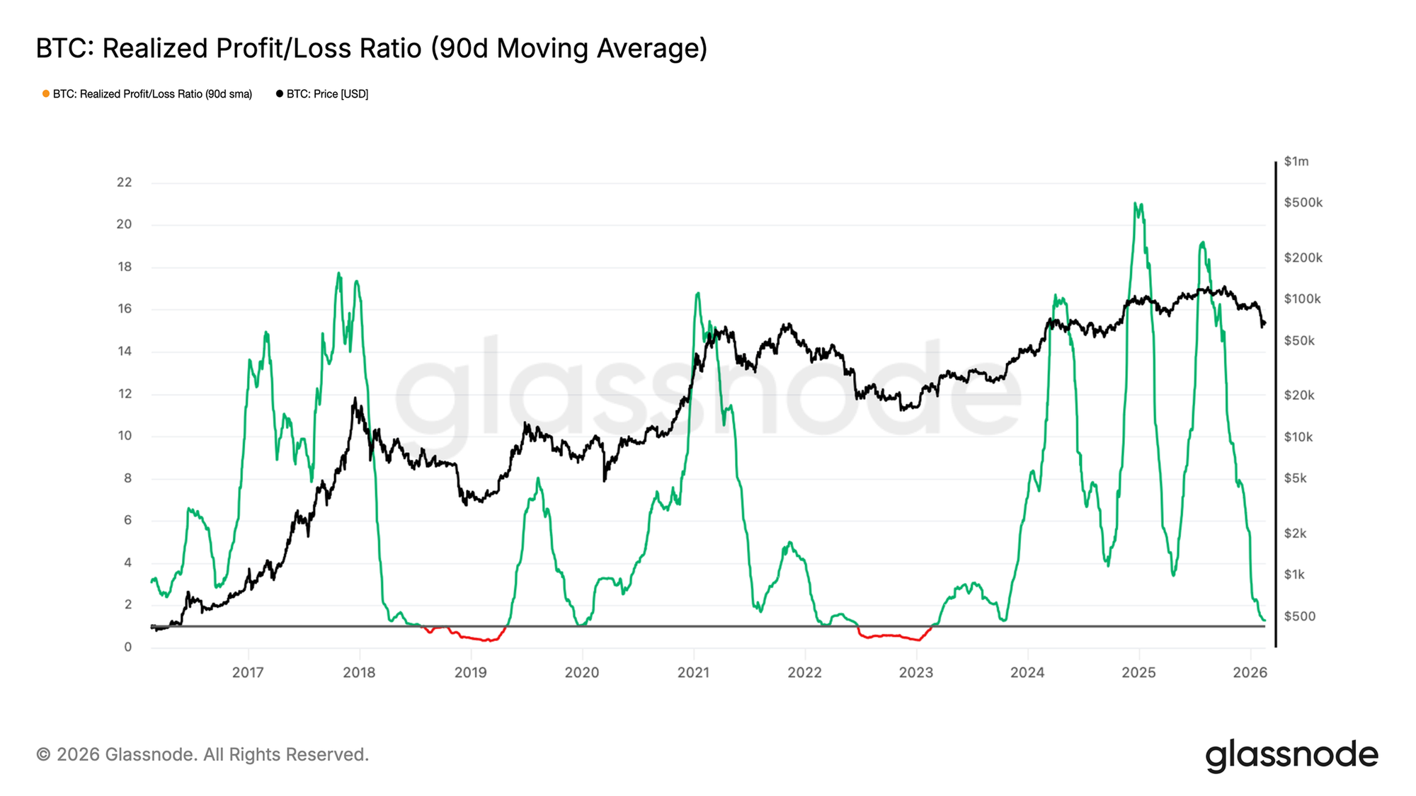 La media móvil a 90 días de esta métrica ha descendido nuevamente hacia el rango entre 1 y 2, una zona que históricamente se caracteriza por ser el hogar de transición desde las primeras fases bajistas hacia entornos de mayor tensión, donde las pérdidas realizadas comienzan a predominar (Ratio P/L Realizado < 1). Esta compresión indica que la recogida de beneficios es limitada y que la rotación de capital sigue siendo comedida.