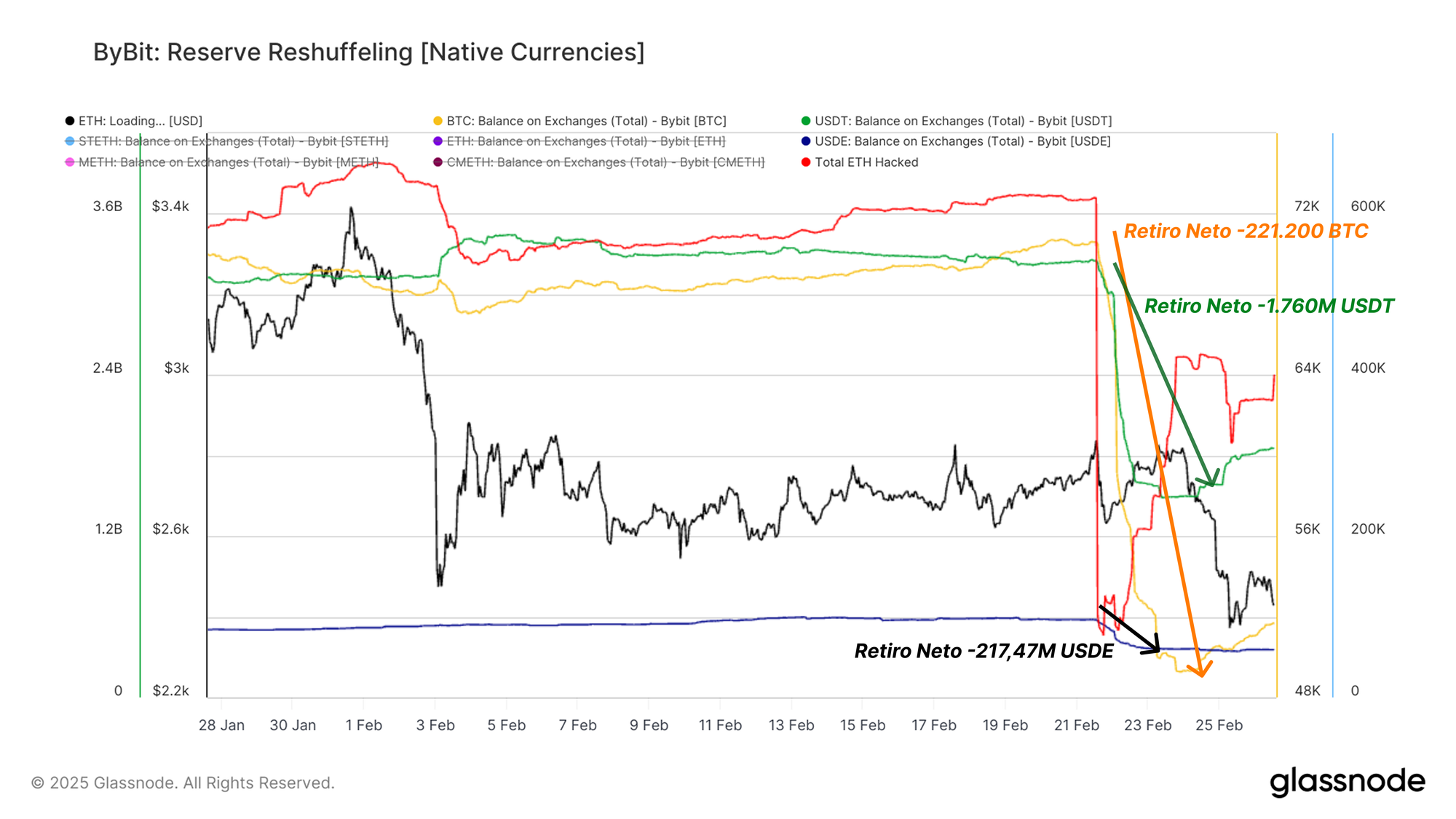 Para el 24 de febrero del 2025, las reservas de BTC, USDT y USDE de Bybit registraron salidas netas significativas: