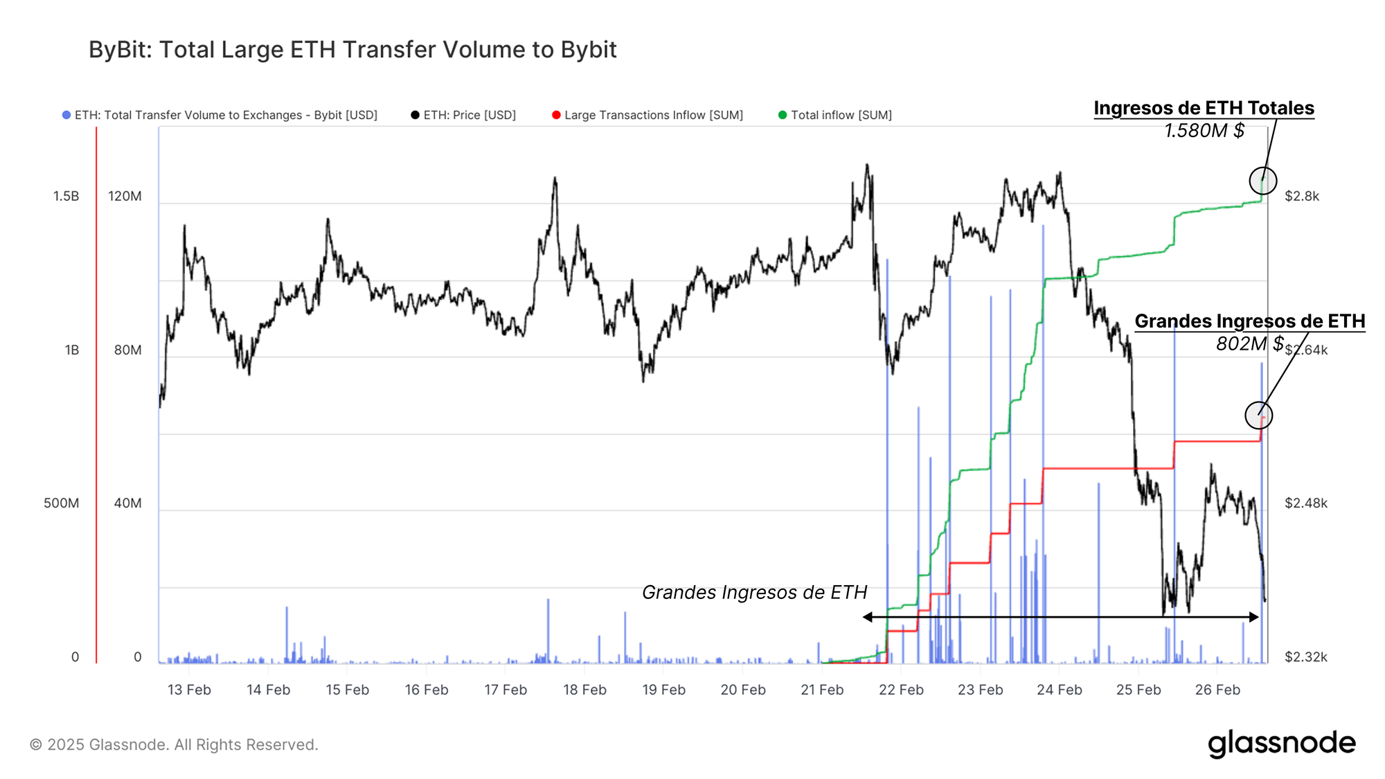 Para el 26 de febrero del 2025, Bybit recibió un flujo de Ethereum entrante de 1.580M $, de los cuales 802M $ (50,7%) provinieron de tan sólo ocho transacciones de gran tamaño.