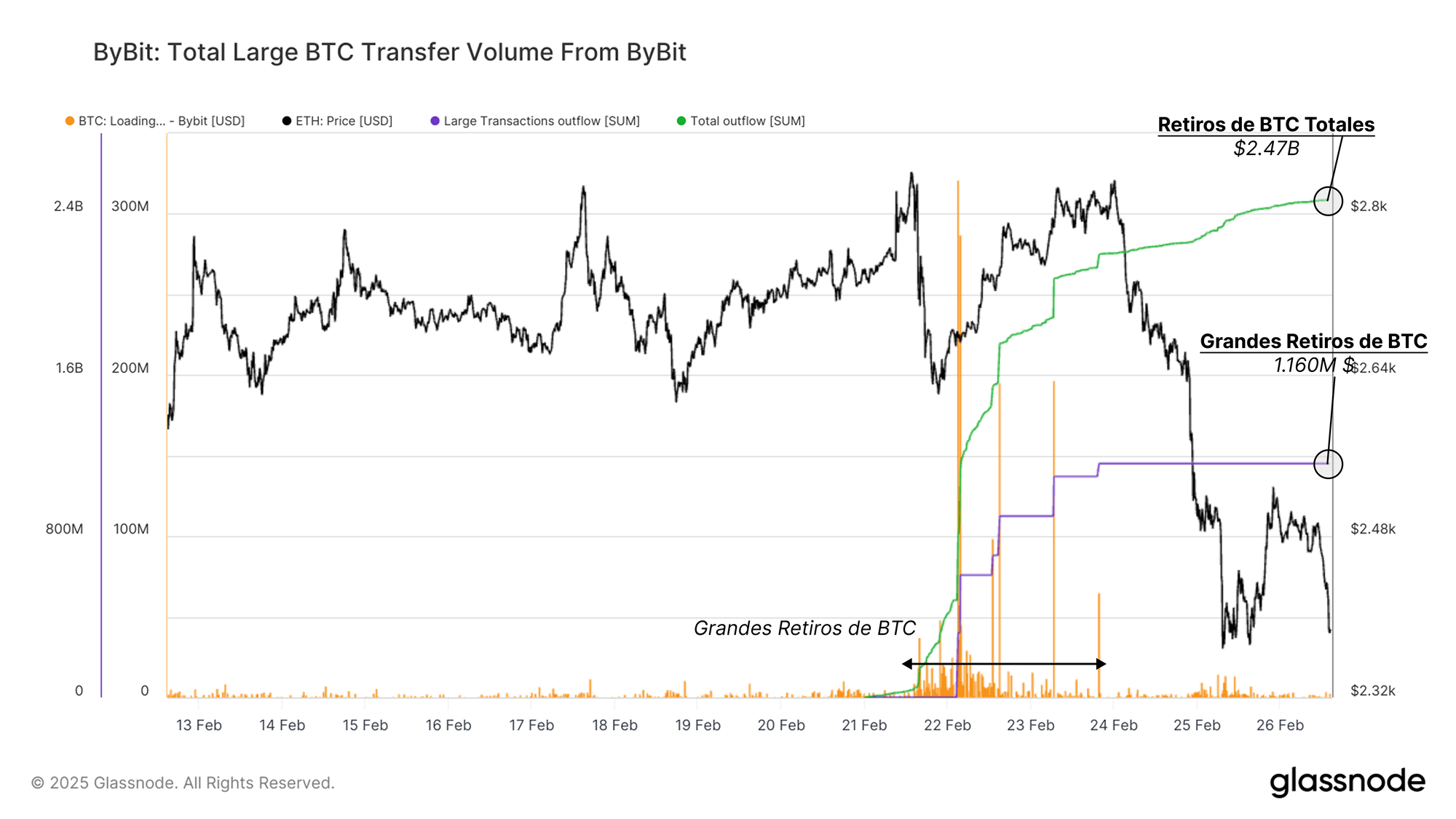 Mientras Bybit trabajaba en la recomposición de sus reservas de Ethereum, el escape de Bitcoin de la plataforma también fue sustancial. Desde el momento del hackeo, las salida neta de BTC alcanzó los 2.470M $, con un 47,2% de ese total (1.160M $) retirados a través de sólo cinco grandes transacciones.