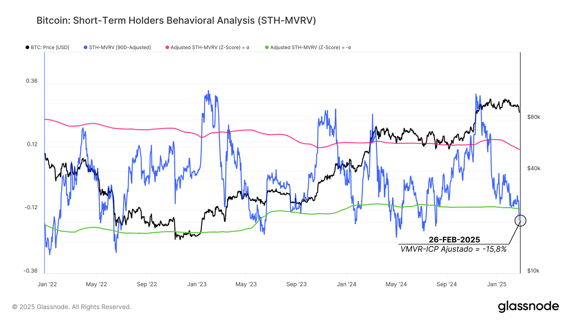 Al Bitcoin retroceder hasta el vacío de la oferta realizada, los inversores a corto plazo se enfrentan a unas pérdidas no realizadas cada vez más severas. Tanto el VMVR-ICP como el RGPG-ICP han caído por debajo de las bandas estadísticas más bajas, lo que indica que se ha producido una creciente materialización de pérdidas entre los nuevos inversores debido a la reducción de sus márgenes de beneficio.