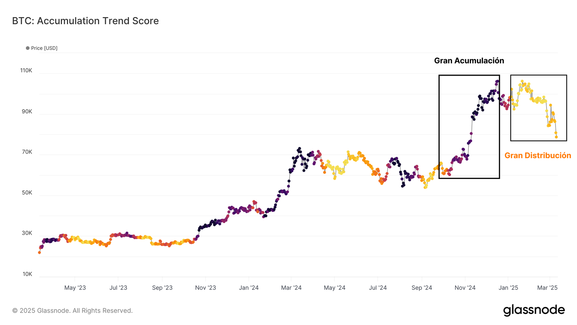 La gráfica a continuación muestra cómo a varios ciclos de acumulación les han seguido fases de distribución, que históricamente a su vez han derivado en una acción de precio más debilitada. La fase de distribución más reciente comenzó en enero del 2025, coincidiendo con la brusca corrección que tuvo Bitcoin desde los 108.000$ hasta los 93.000$.