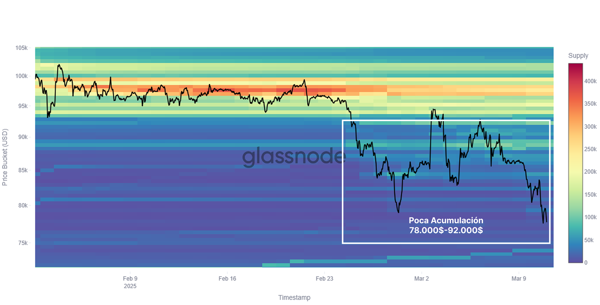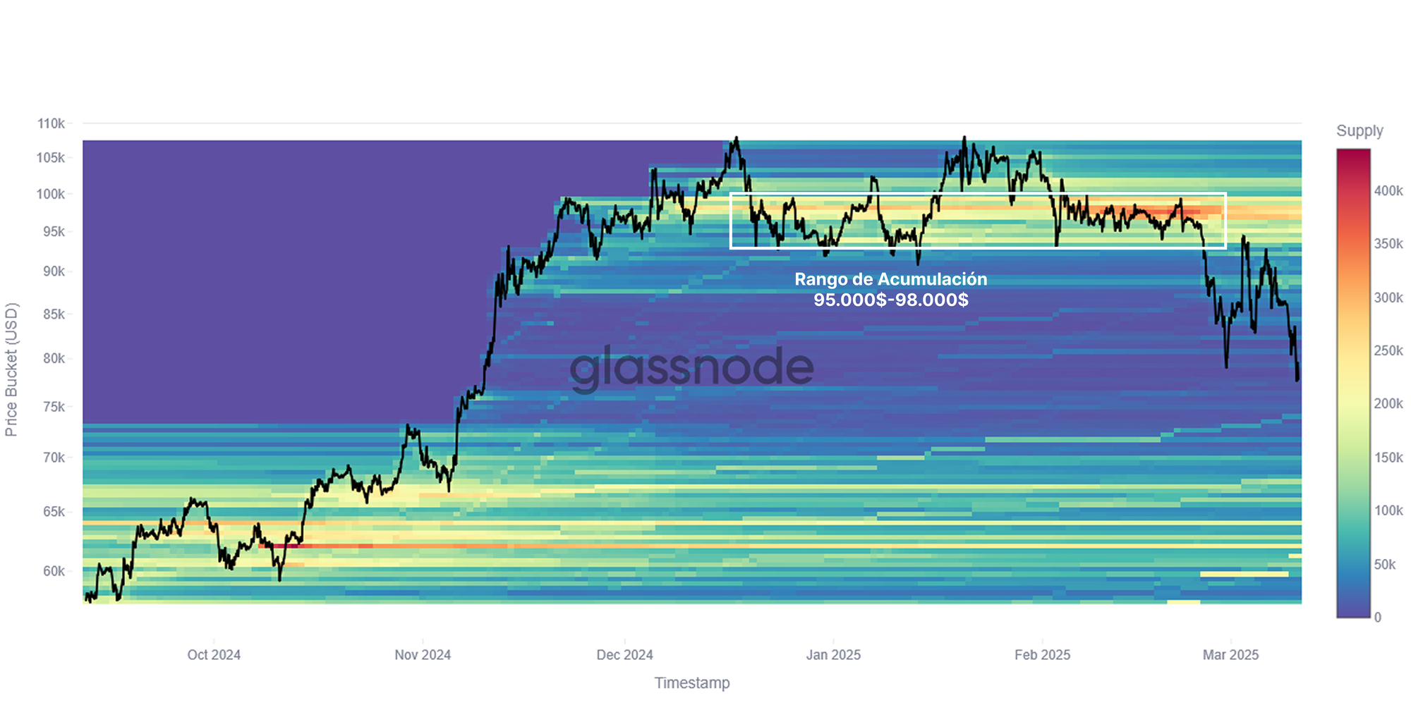 El Mapa de Calor de la Distribución del Coste Base confirma que, a medida que aumentaba la incertidumbre macroeconómica, la demanda de acumulación se debilitaba, recalcando que la confianza inversora es un factor clave en los patrones de comportamiento de acumulación. La ausencia de compras en los niveles más bajos sugiere que está en marcha una rotación de capital, lo que podría dar paso a una fase de consolidación más prolongada o incluso desembocar en una corrección más severa antes de que el mercado encuentre una base de soporte sólida.