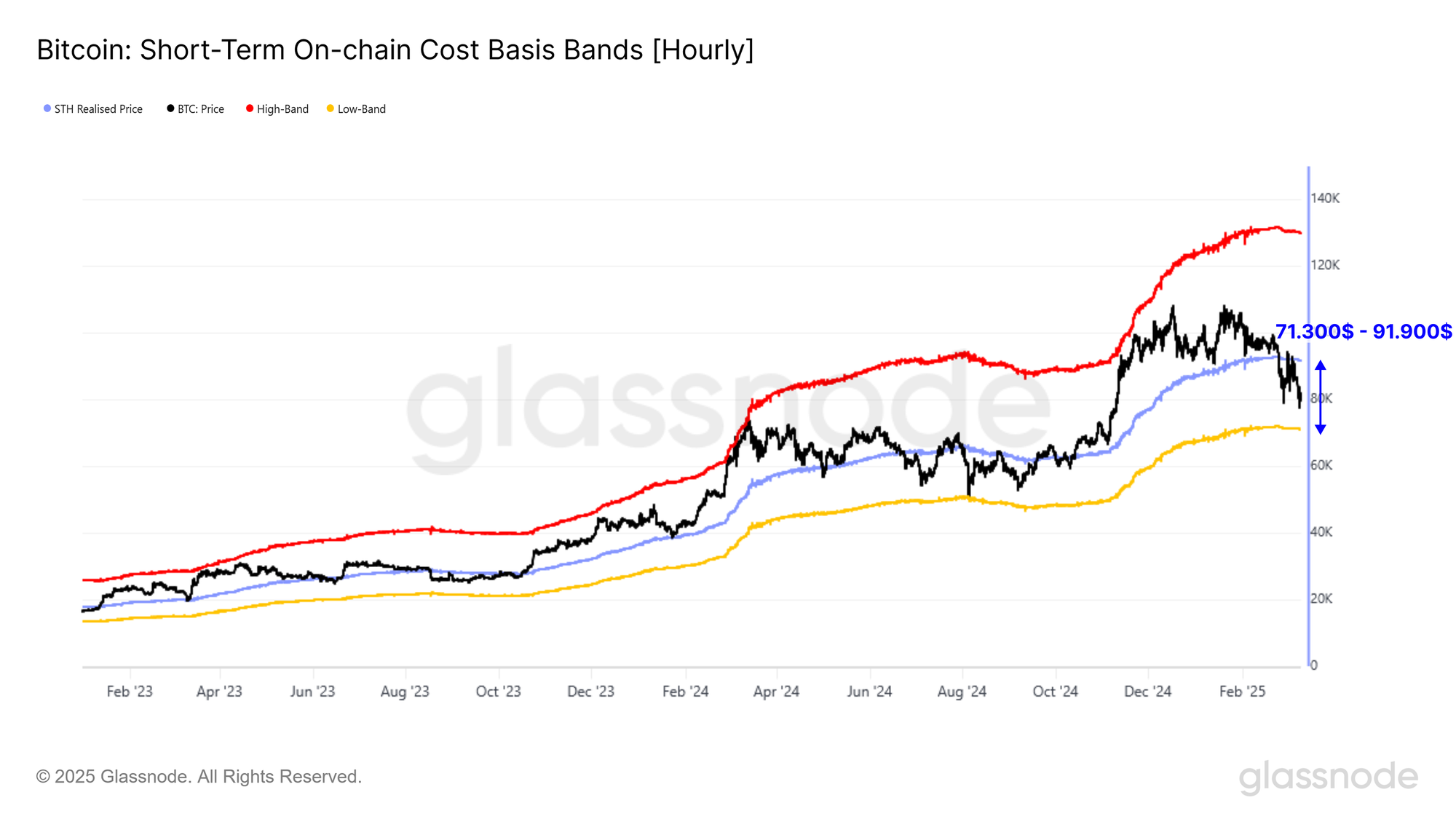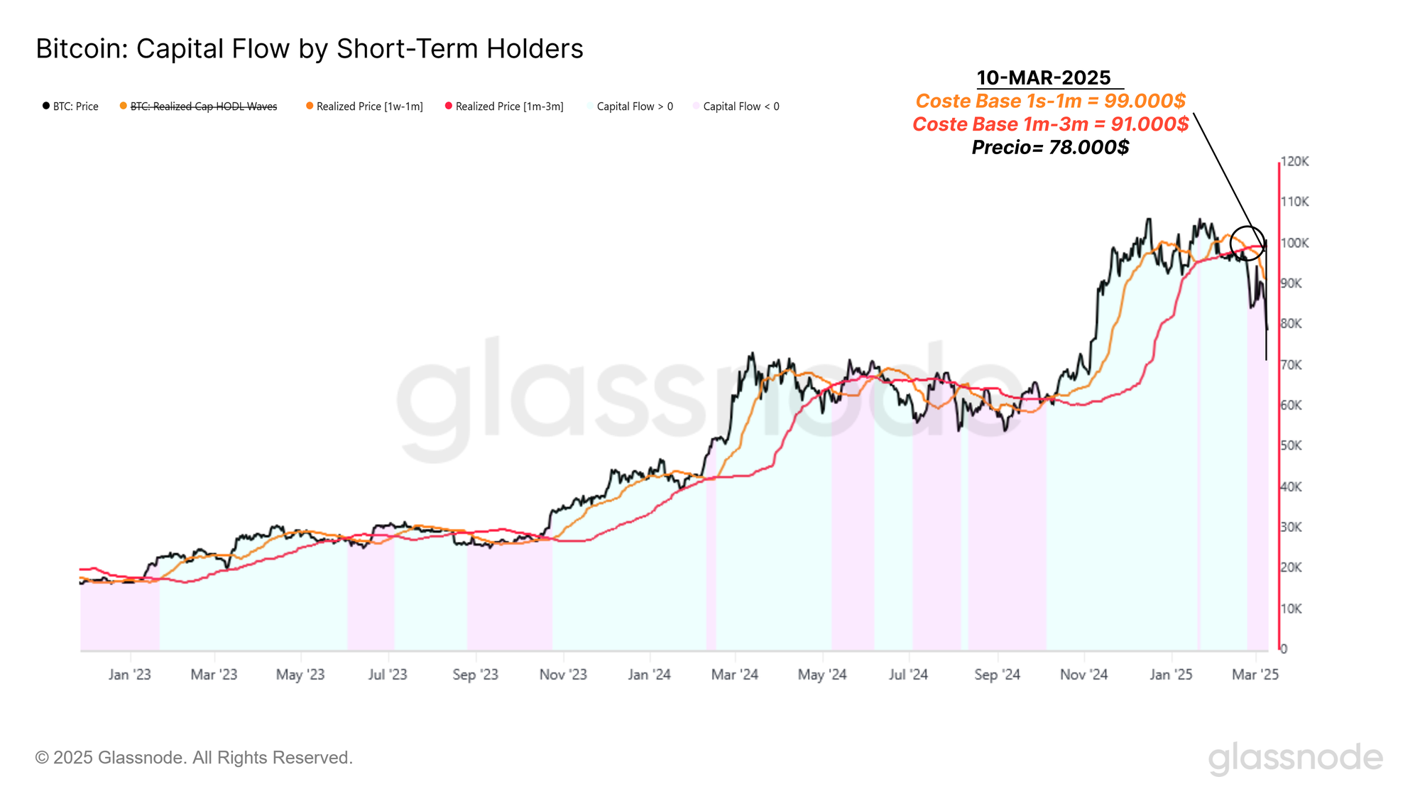 Desde finales de febrero, a medida que las condiciones de liquidez se volvieron más restrictivas, la confianza para continuar acumulando comenzó a deteriorarse. Factores de riesgo externos, como el hackeo a Bybit y el aumento de las tensiones arancelarias en EE.UU., intensificaron la incertidumbre en los mercados, llevando a Bitcoin a cotizar por debajo de los 92.000$. Este nivel es crucial, ya que representa la pérdida del soporte del coste base de los Inversores a Corto Plazo.