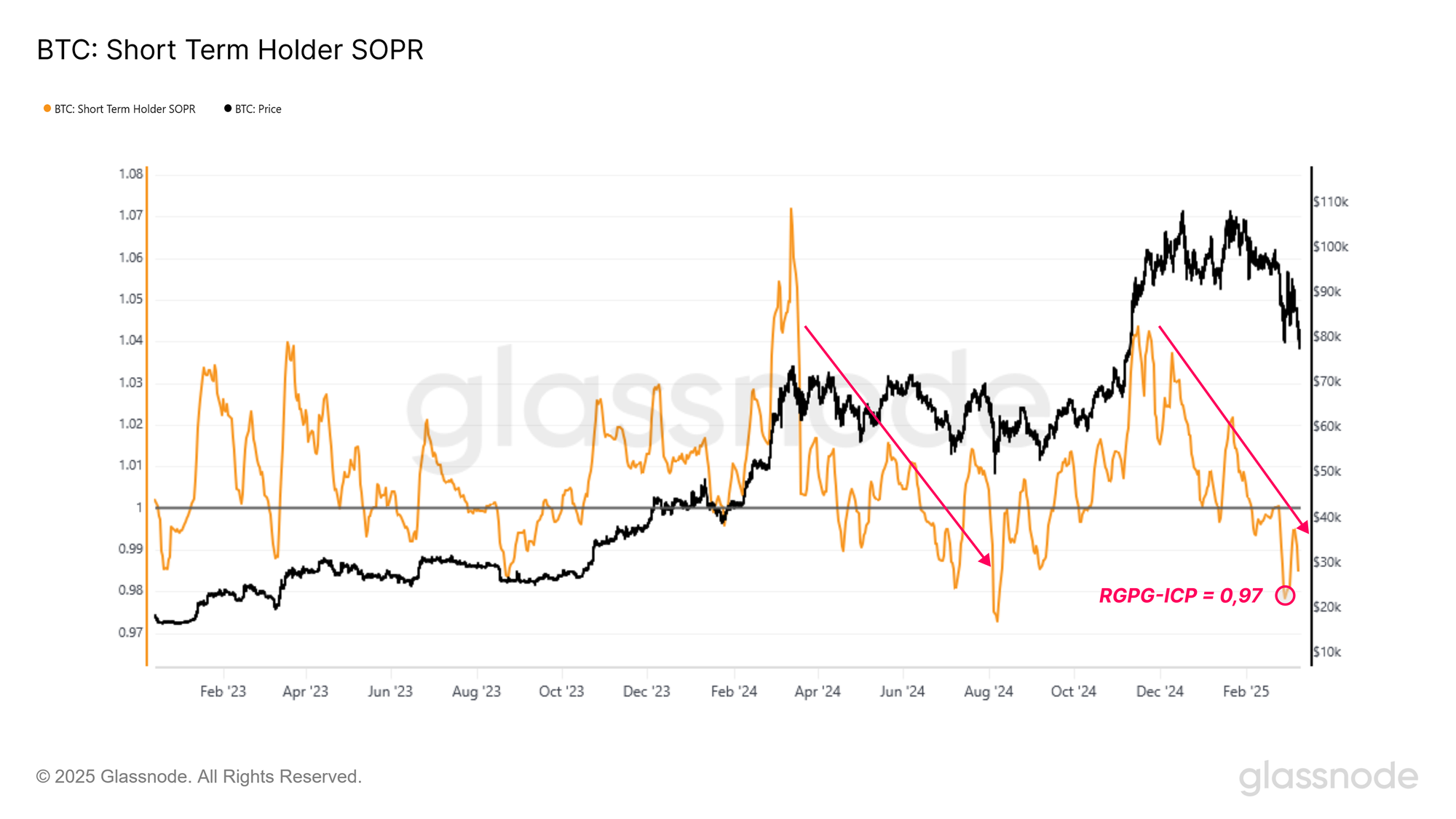 Desde que el precio cayó por debajo de los 95.000$, la media móvil de 196 horas del RGPG-ICP se ha mantenido por debajo de 1, lo que sugiere que la mayoría de los inversores a corto plazo están realizando pérdidas. En los puntos más extremos, cuando el precio se desplomó hasta los 78.000$ este ratio cayó hasta el 0,97, evidenciando la magnitud de la capitulación.