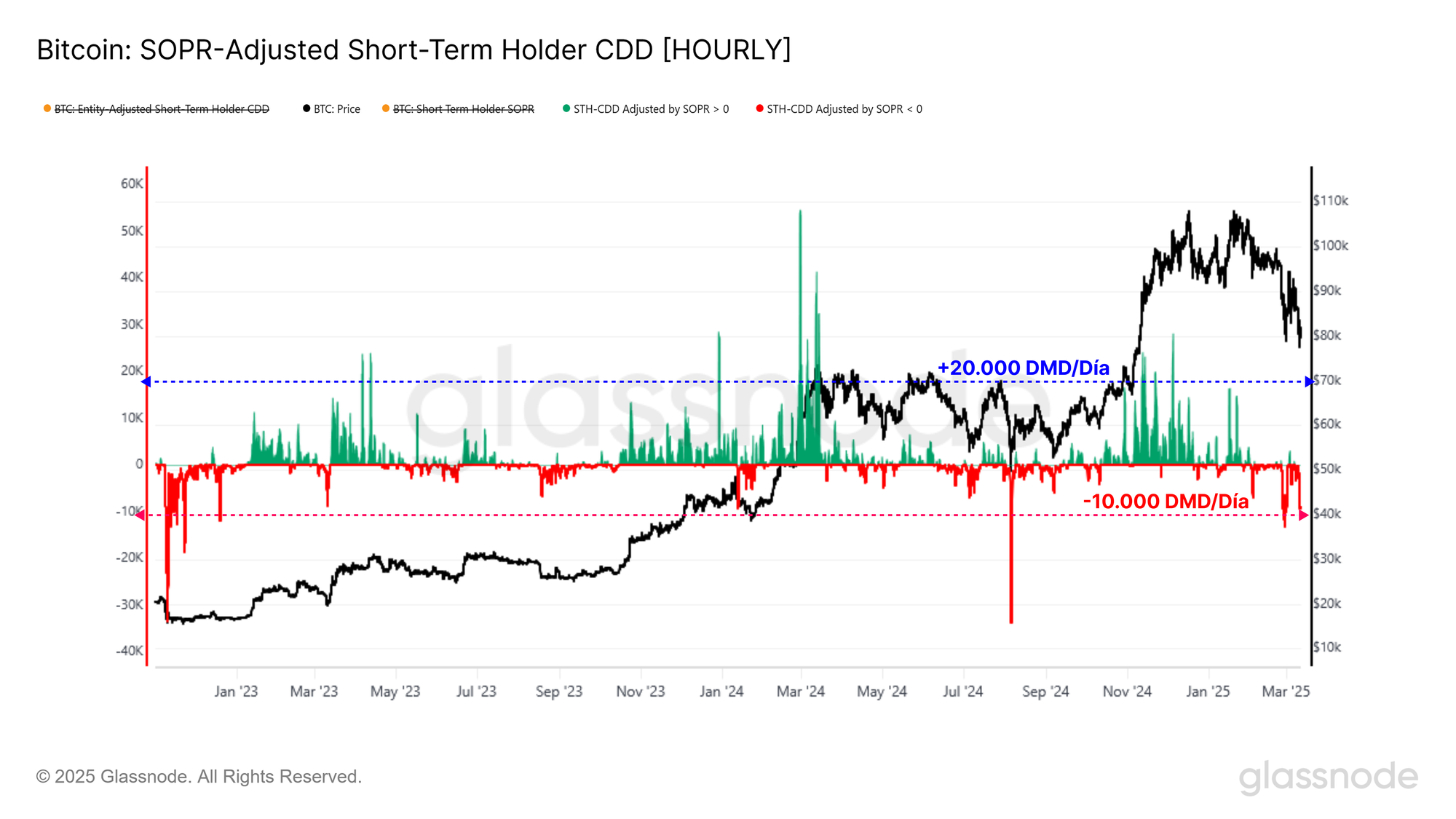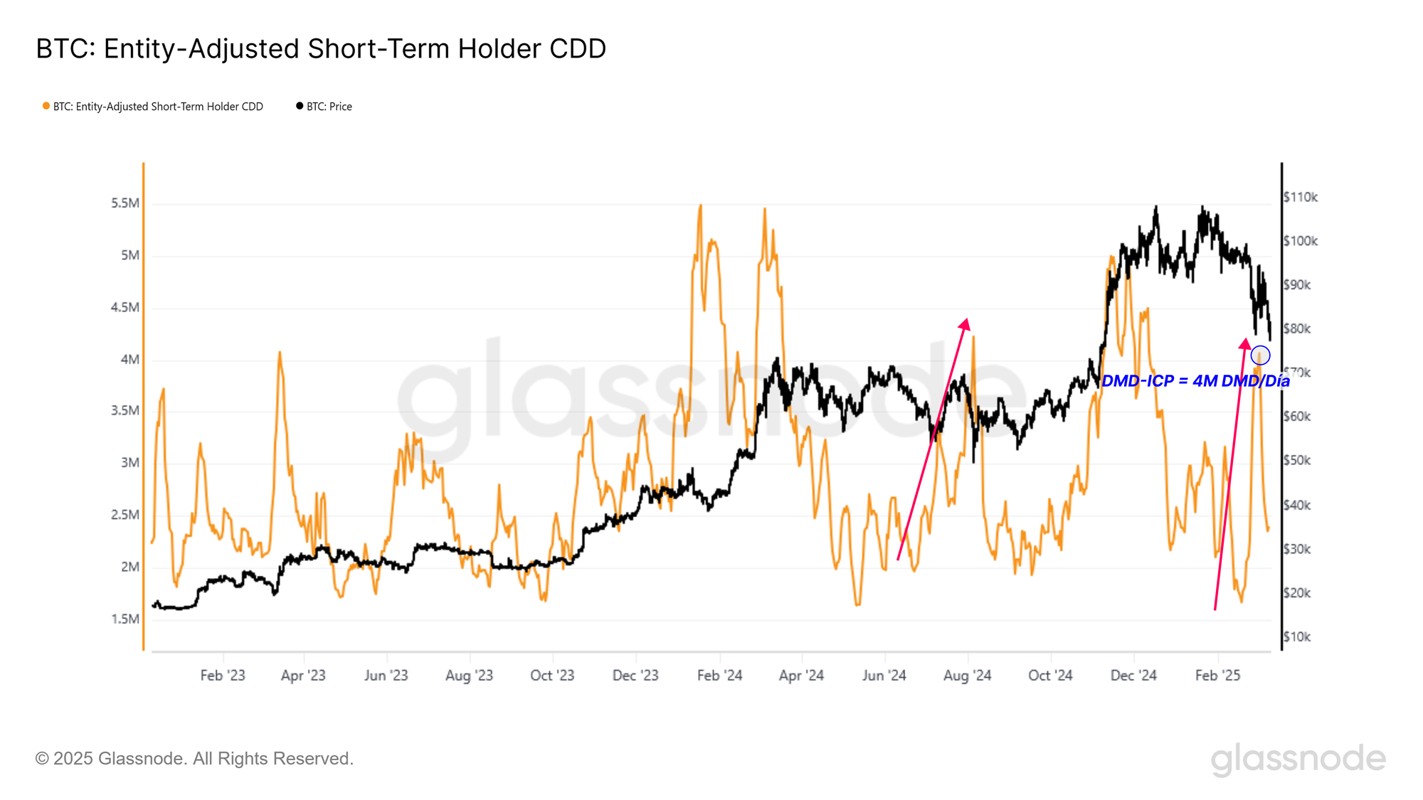 Además de analizar la realización de pérdidas, otro indicador crucial para evaluar las ventas impulsadas por el miedo es la Destrucción de Días Monetarios de los Inversores a Corto Plazo (DMD-ICP), que mide el peso económico de las monedas gastadas por los nuevos inversores, teniendo en cuenta tanto el volumen como el tiempo de inversión de cada moneda.