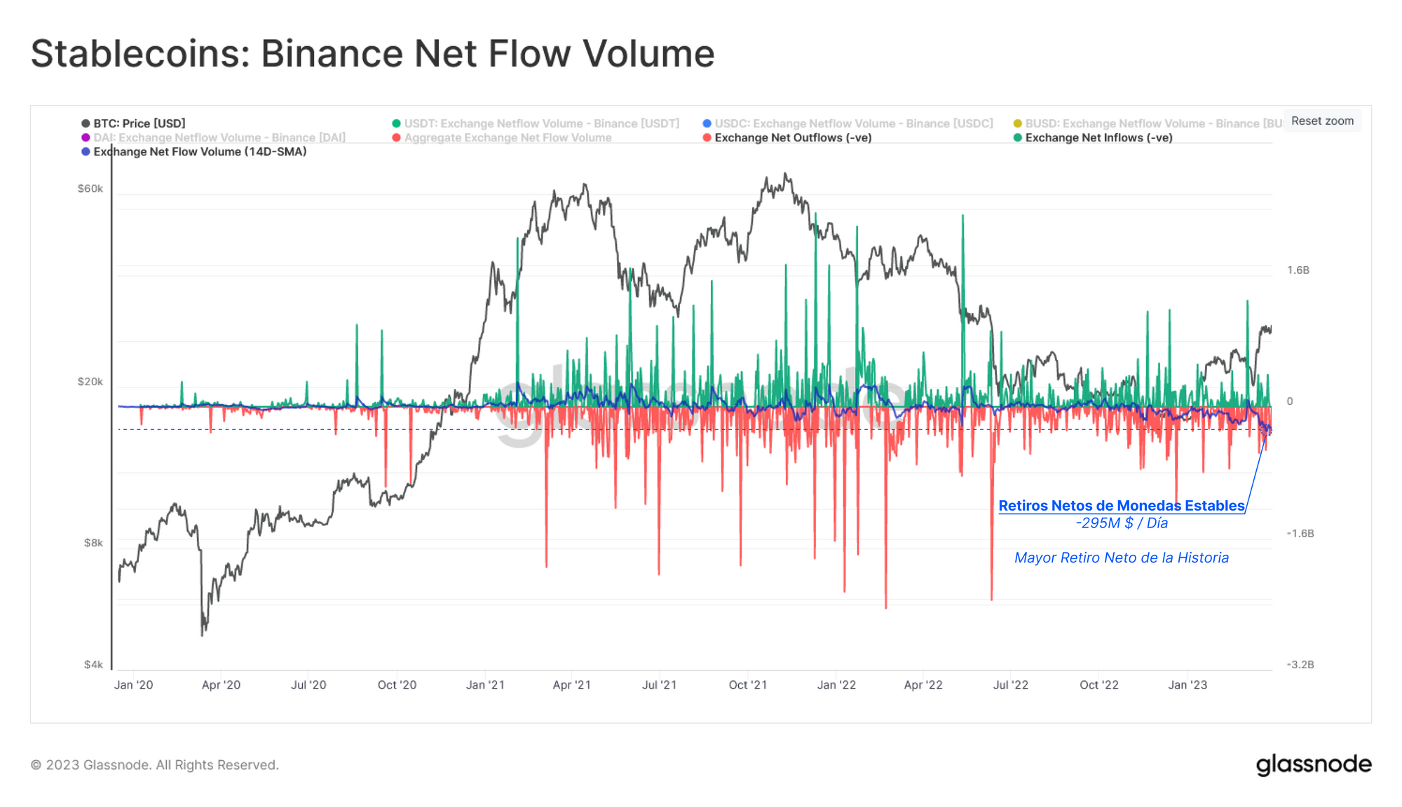 En este 2023 Binance ha recibido cada vez más presión por parte de los organismos regulativos estadounidenses, hasta que lo último parece ser una denuncia formal contra el exchange y su CEO por las supuestas violaciones regulativas de CFTC. Por toda la incertidumbre que rodea últimamente al grado de solvencia de bancos y exchanges, vamos a examinar el flujo neto de capital que entra y sale de Binance para comprender el sentimiento del mercado al respecto.