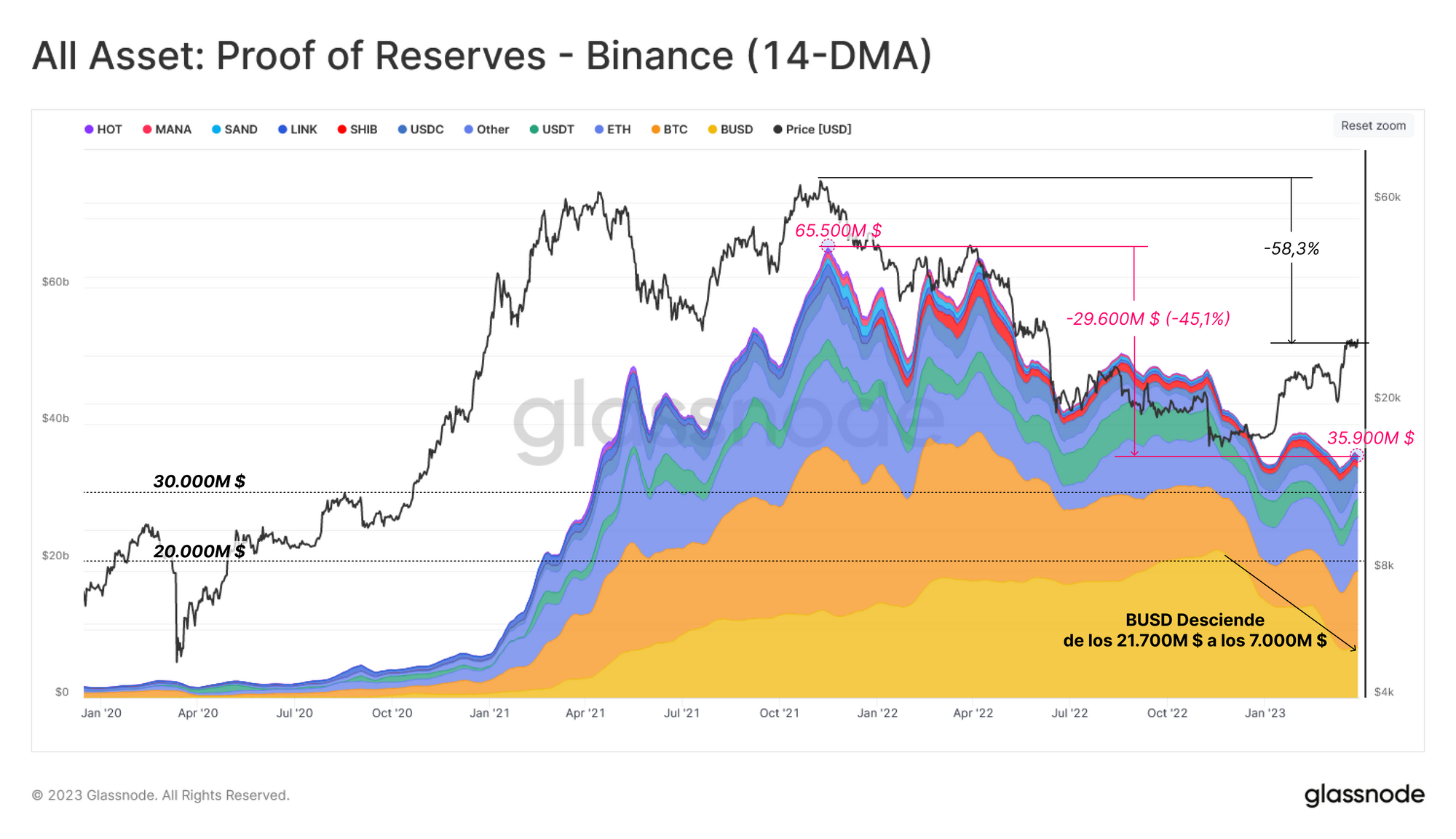 Los principales responsables de este declive son los desplomes en el precio de los activos (que afectan a los activos no-estables), aunque más recientemente también se debe a los tremendos reembolsos de BUSD que se han estado ejecutando. La carrera alcista que llevamos disfrutando en lo que va de año ha provocado que las reservas de Binance en términos de dólares americanos vuelvan esta semana a rondar los 35.000M $.