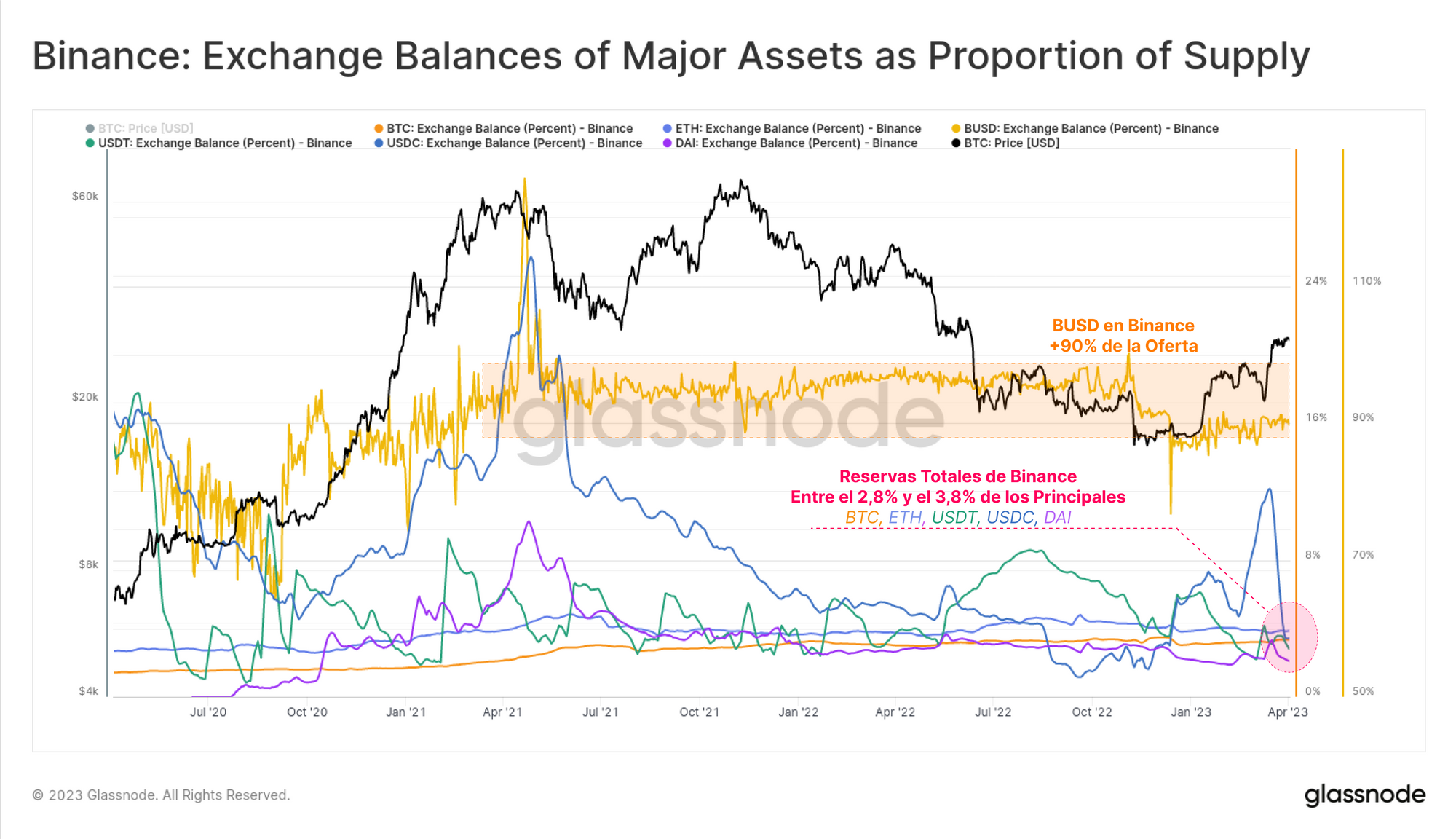Para recalcar la proporción de todos los activos que hay en las reservas de Binance, vamos a compararlas como un porcentaje dentro de toda la oferta en circulación. Binance normalmente tiene bajo custodia en torno al 2,8% y el 3,8% de la oferta en circulación de los principales activos BTC, ETH, USDT y USDC.
