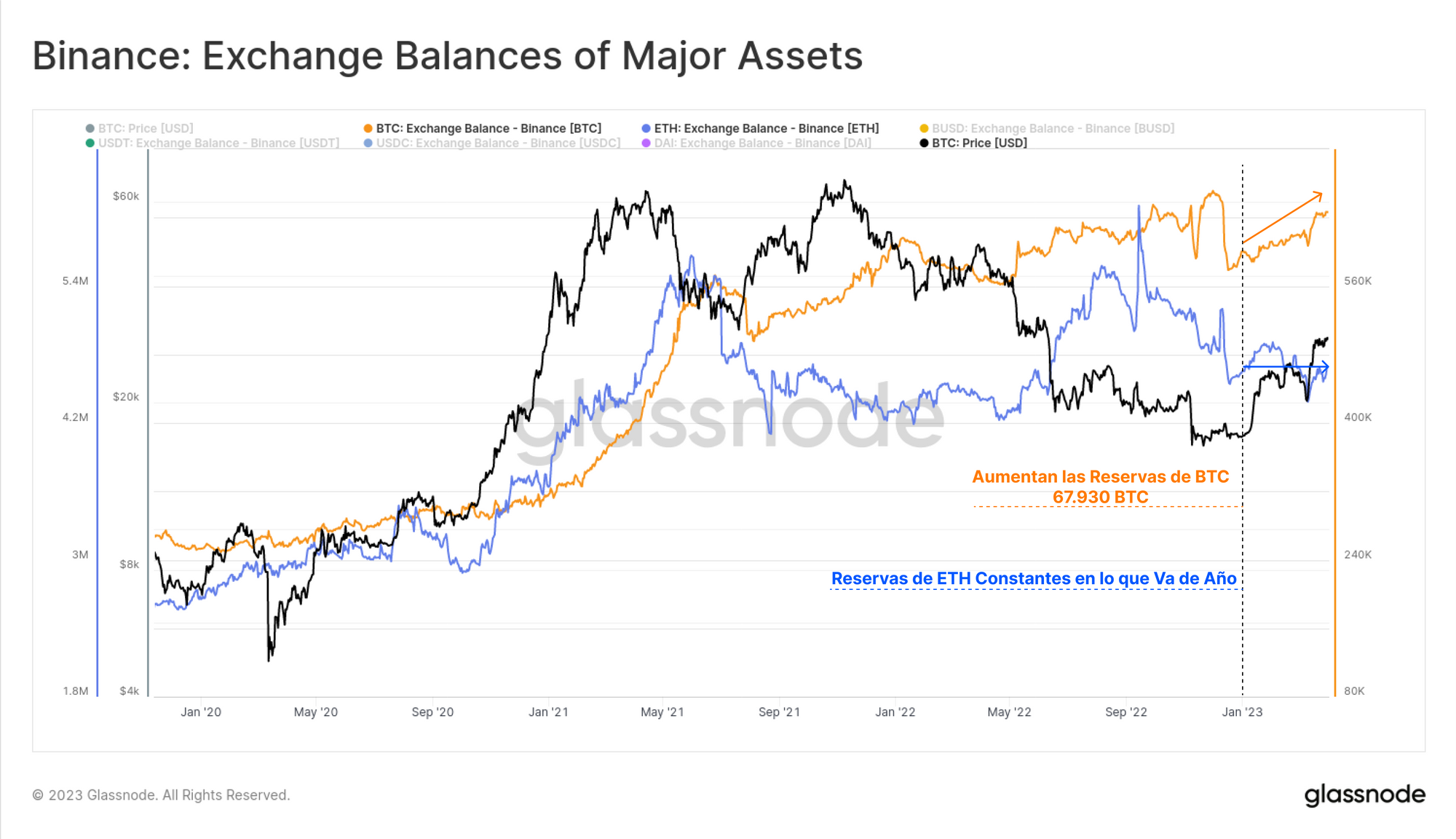 Se aprecia perfectamente el gran tamaño de tanto las crecidas como las caídas del BUSD almacenado en la plataforma de Binance a lo largo de este ciclo 2020-23. Llaman especialmente la atención lo bajos que son los balances de USDC (1.160M $) y USDT (2.170M $), debido en parte a la estrategia de Binance con la que en estos últimos meses ha tratado de volcar todo el volumen de trading posible hacia los pares BUSD.