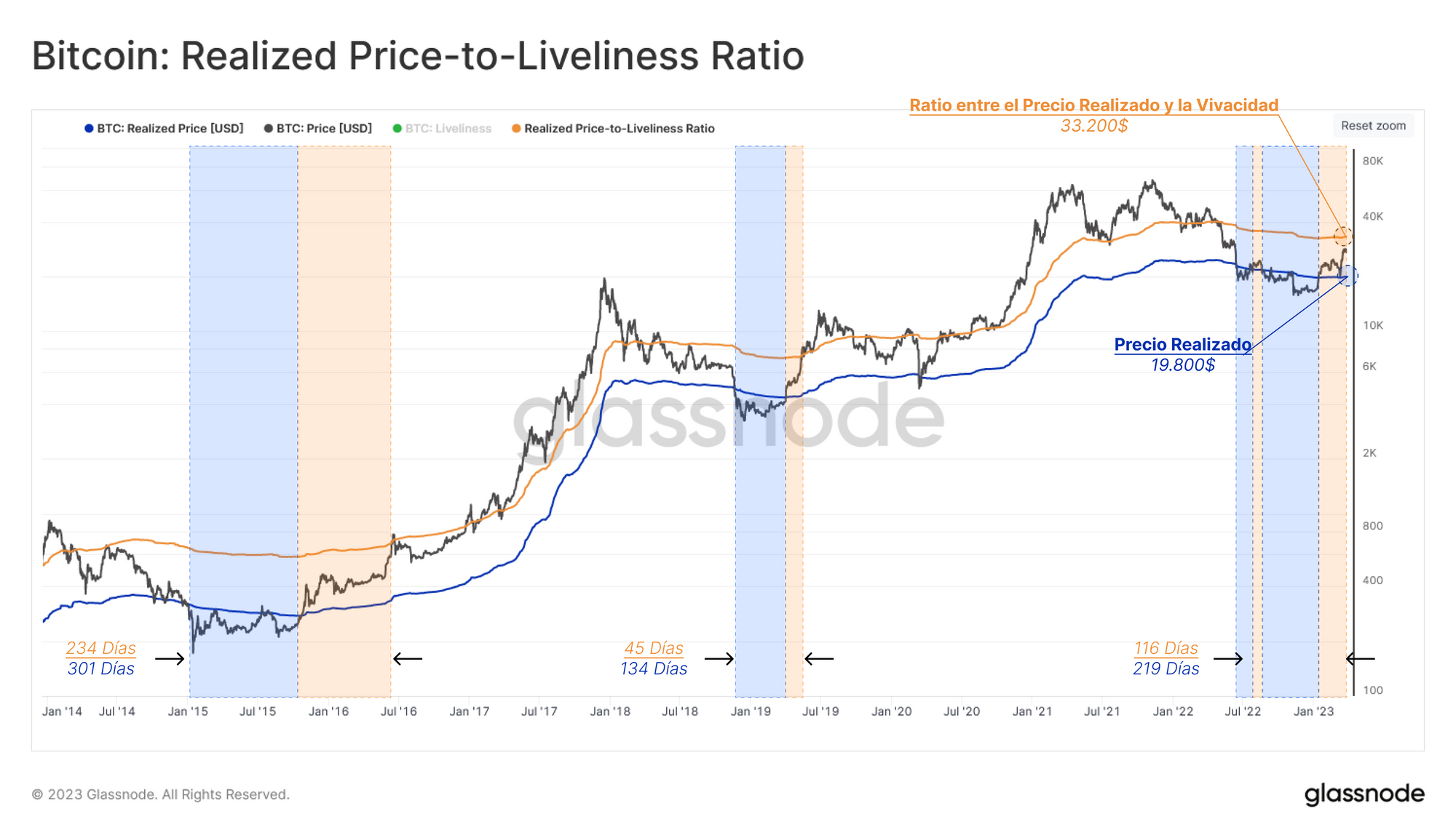- La linde superior la delimita el Ratio entre el Precio Realizado y la Vivacidad 🟠 (33.200$), que es una variante del Precio Realizado que tiene más en cuenta el nivel de actividad monetaria del blockchain.