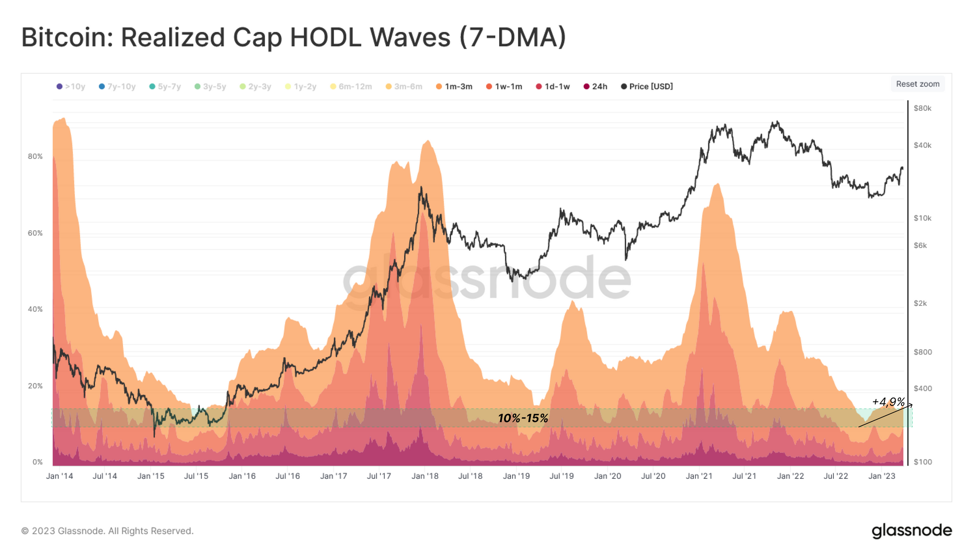 Según damos cierre al primer cuarto el 2023, el precio de BTC ya ha escalado más de un 68%, lo que pone de vuelta en números verdes a muchos inversores. La reacción de los inversores de Bitcoin es observable gracias a las Ondas de la Capitalización Realizada, las cuales monitorizan la distribución relativa del capital en términos de dólares americanos que se acumula en las diferentes franjas de edad. Vamos a examinar estas bandas desde un enfoque binario: