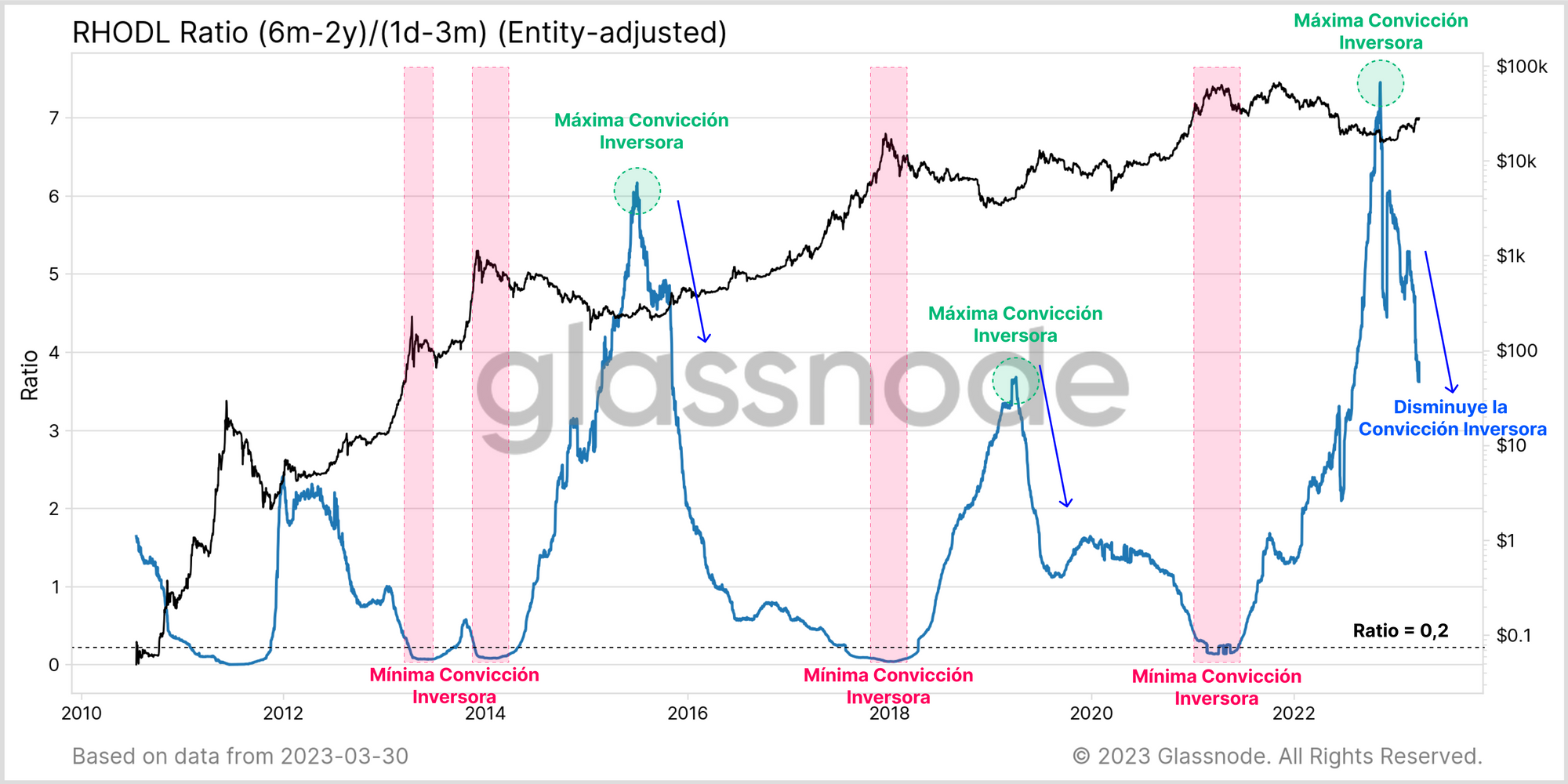 La actual estructura del Ratio de Acumulación Realizada demuestra que se ha producido una importante rotación de capital desde que colapsó FTX, en la que se han transferido muchas monedas de los inversores a largo plazo al grupo que conforman los nuevos inversores. En los anteriores ciclos de mercado encontramos este mismo descenso del Ratio justo en los puntos de inflexión, lo que prueba que están cambiando las tornas y el mercado pivota de una fase a otra.