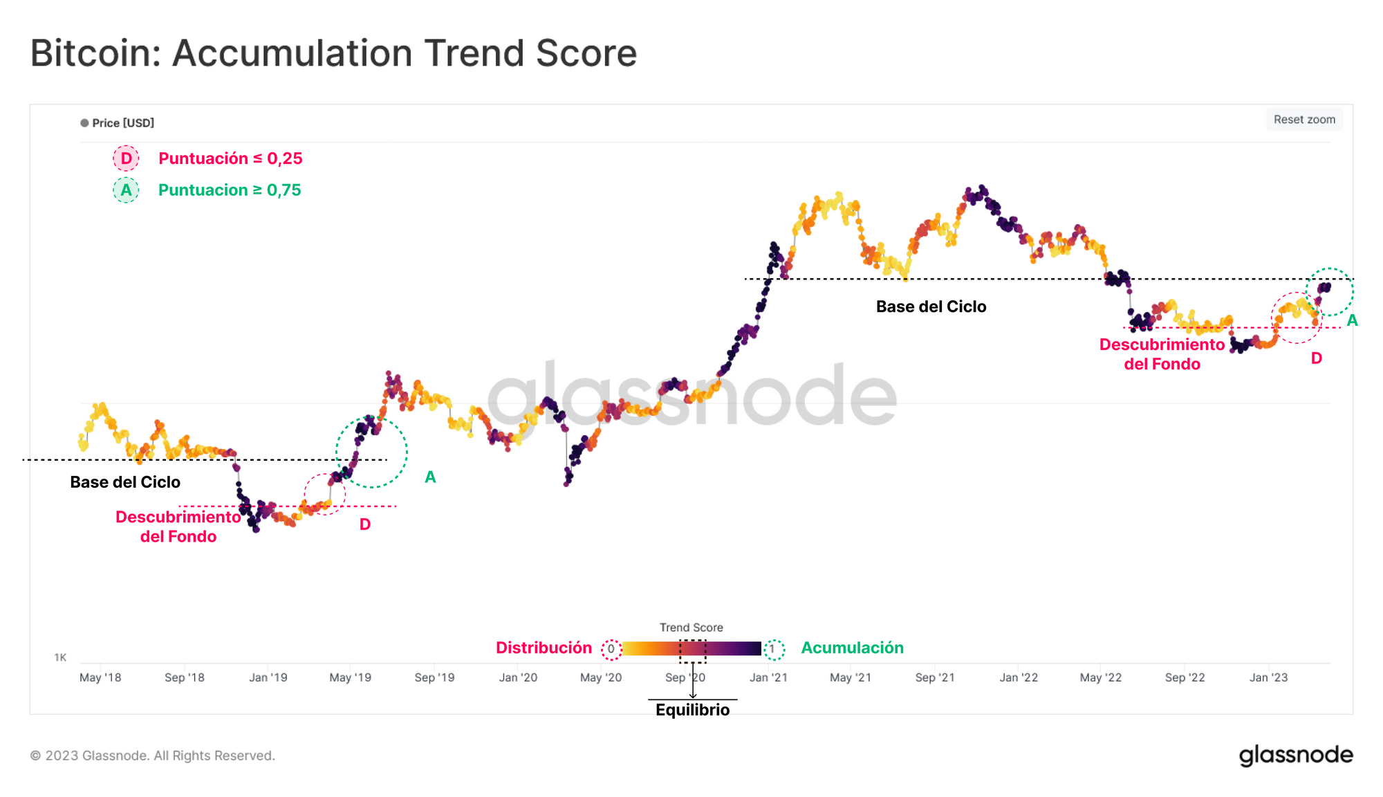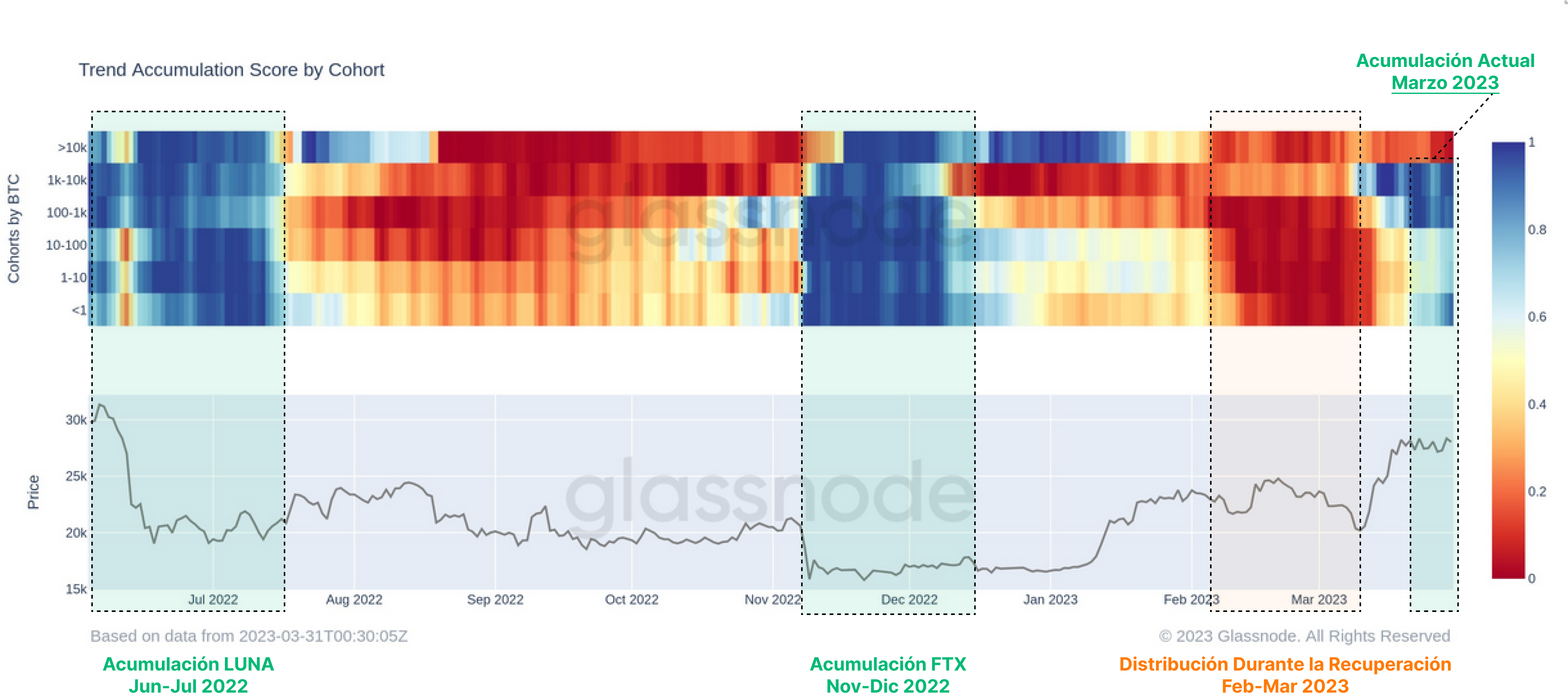 La Puntuación de la Tendencia de Acumulación muestra los cambios que se han producido en los últimos 30 días en el balance agregado de los inversores en activo, donde se da más peso a las entidades de mayor envergadura (como ballenas y carteras de dimensiones institucionales). Históricamente, las fases iniciales en las que el mercado se recupera tienden a desencadenar un cierto grado de distribución 🔴, donde se imprimen valores por debajo del 0,25.