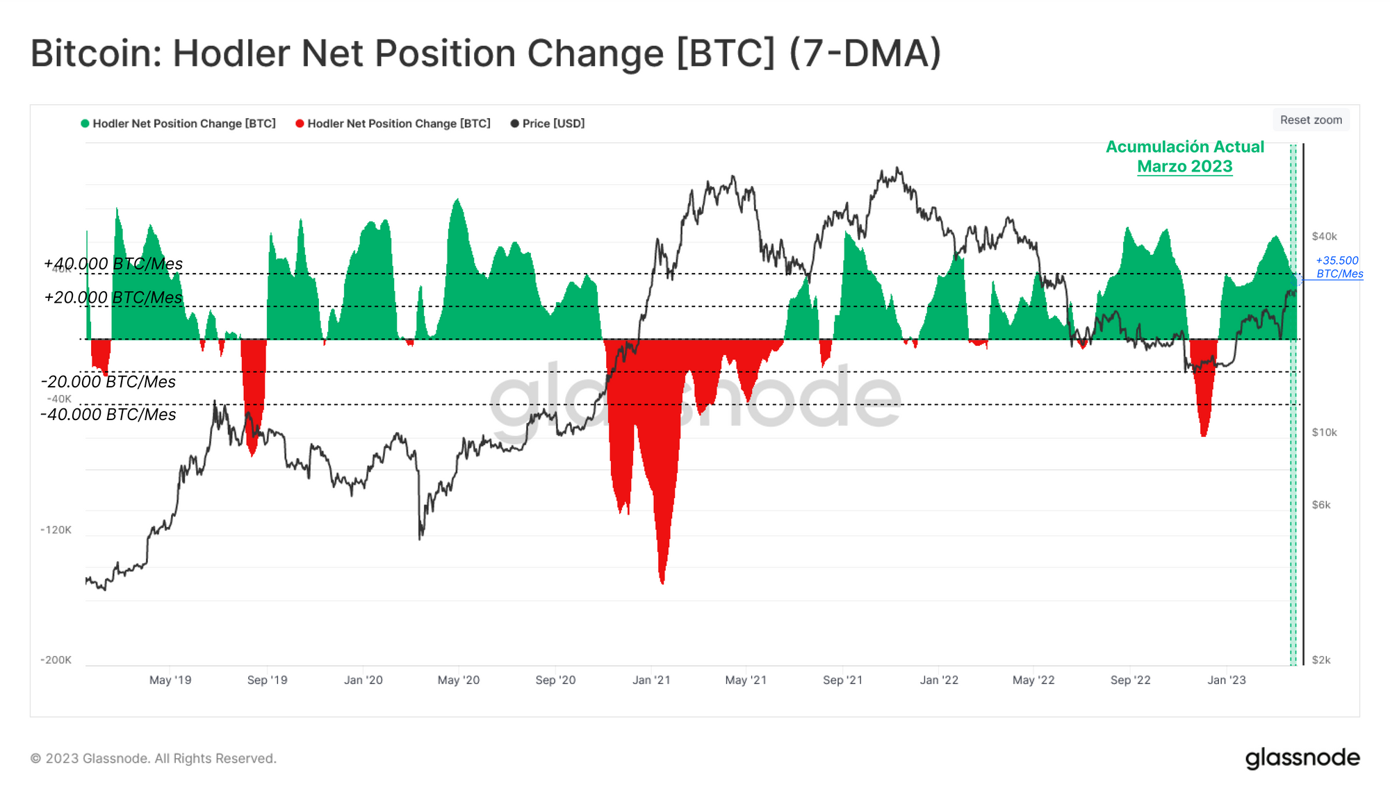 Tras un breve periodo de tiempo con gasto neto durante el crash de FTX, hemos regresado a índices de maduración monetaria, alcanzando los +60.000 BTC/mes, demostrando con ello que la confianza inversora se mantiene elevada.