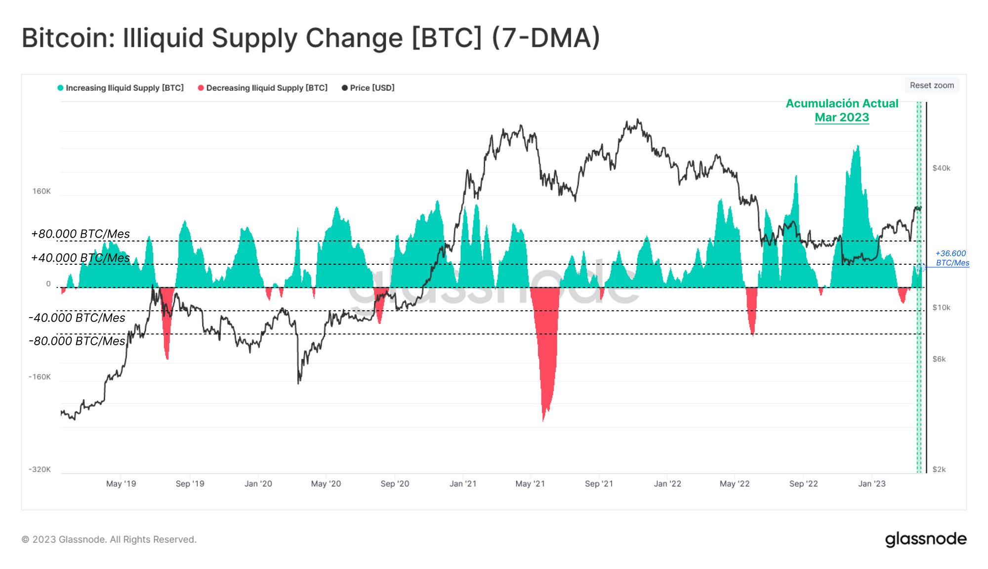 Sorprendentemente, este indicador prueba que en la ecuación de la oferta, la parte ilíquida ha estado absorbiendo ~36.600 BTC/Mes. Estos valores se alinean con nuestras anteriores observaciones relacionadas con el conglomerado HODLer y pone de manifiesto que efectivamente reina la confianza entre los participantes del mercado a pesar de todas las presiones regulatorias.