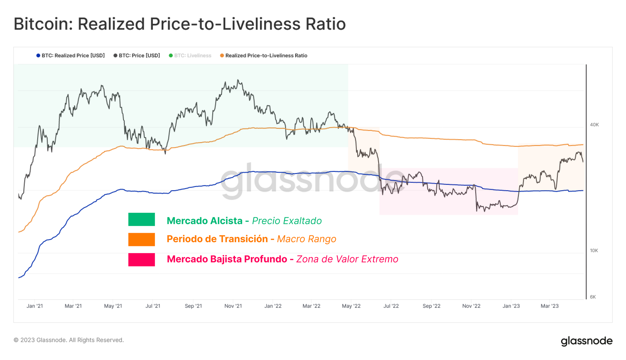 El precio spot de Bitcoin oscila entre dos modelos de valorización del blockchain muy populares: el Precio Realizado en los 19.900$ que representa el precio medio de adquisición de toda la oferta, y el Ratio Realizado-a-Vivacidad que ronda los 33.000$.