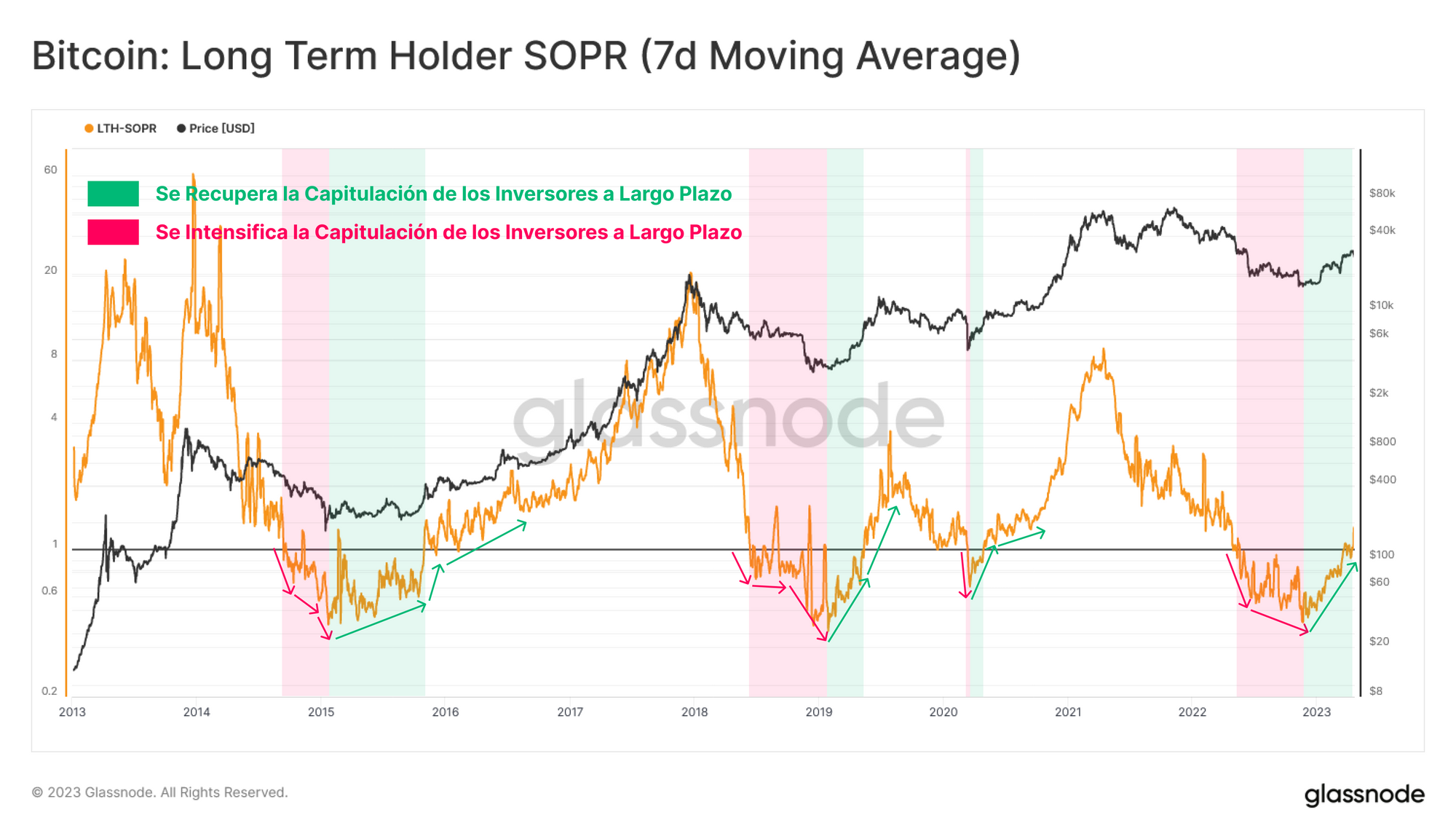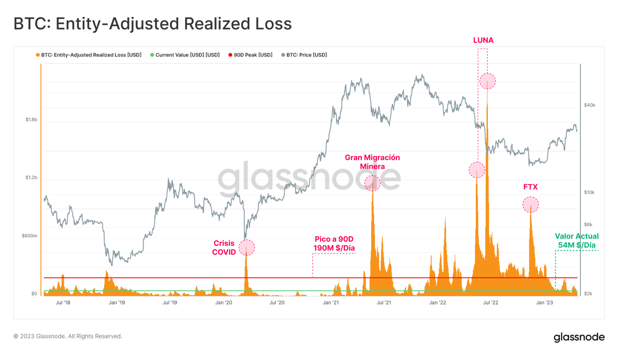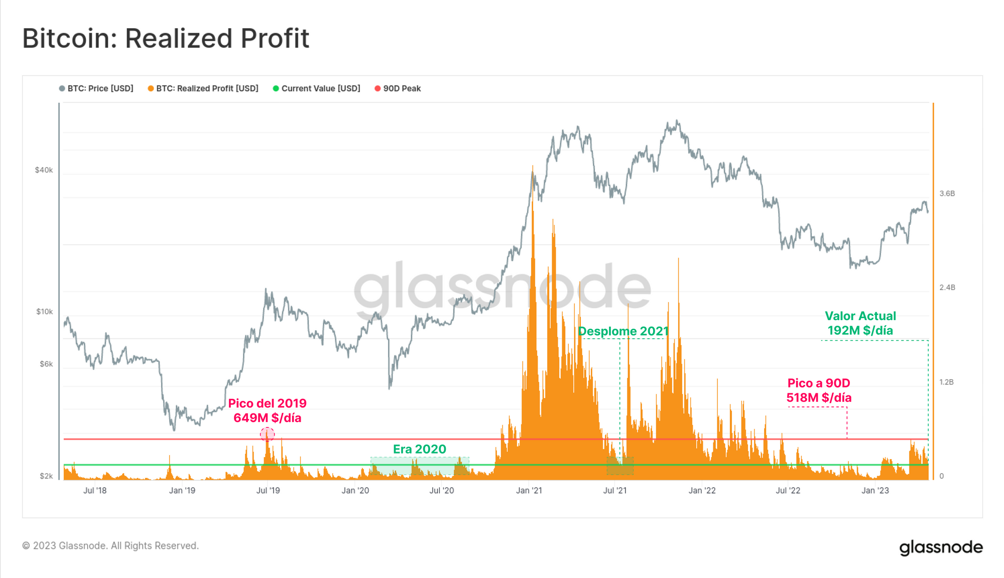 Se puede palpar la misma sensación cuando pasamos al ámbito de las pérdidas realizadas, las cuales continúan descendiendo. Las pérdidas totales siguen siendo muy bajas hoy por hoy cuando las comparamos con los grandes desplomes que hubo durante el 2021-22. Este es un claro indicativo de que se ha alcanzado cierto grado de agotamiento vendedor a gran escala, al menos visto desde la perspectiva de los inversores que materializaron esas enormes pérdidas (es decir, los que compraron en máximos de ciclo).