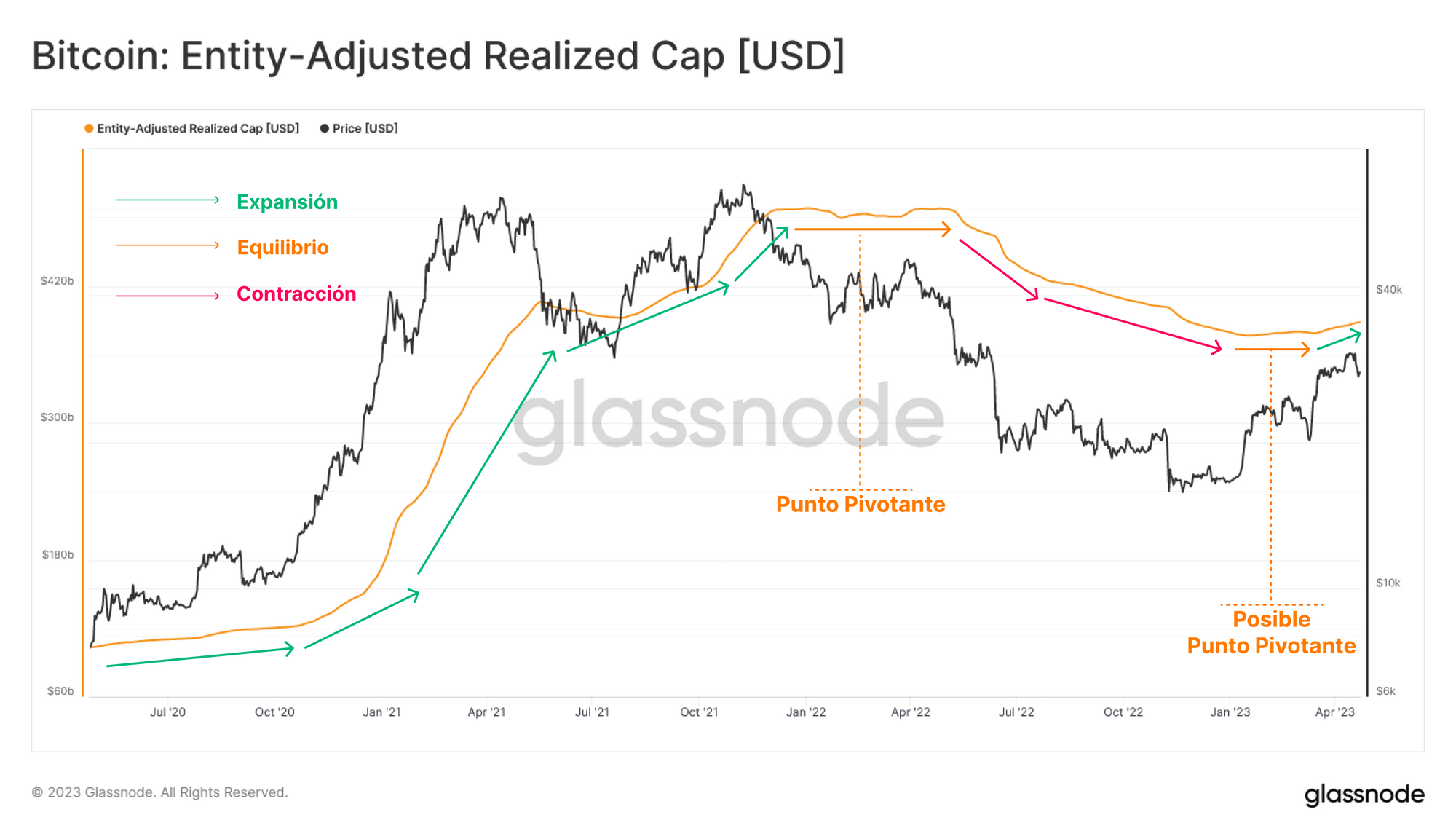 Por último, podemos estimar la suma acumulativa de todos los eventos de realización de perdidas y ganancias, más comúnmente conocida como la Capitalización Realizada. Después de haber crecido tan significativamente en ambos impulsos de mercado alcista del 2020-21, el 2022 hizo que escapase una gran cantidad de capital del network de Bitcoin, hasta que regresamos a los niveles de julio del 2021.