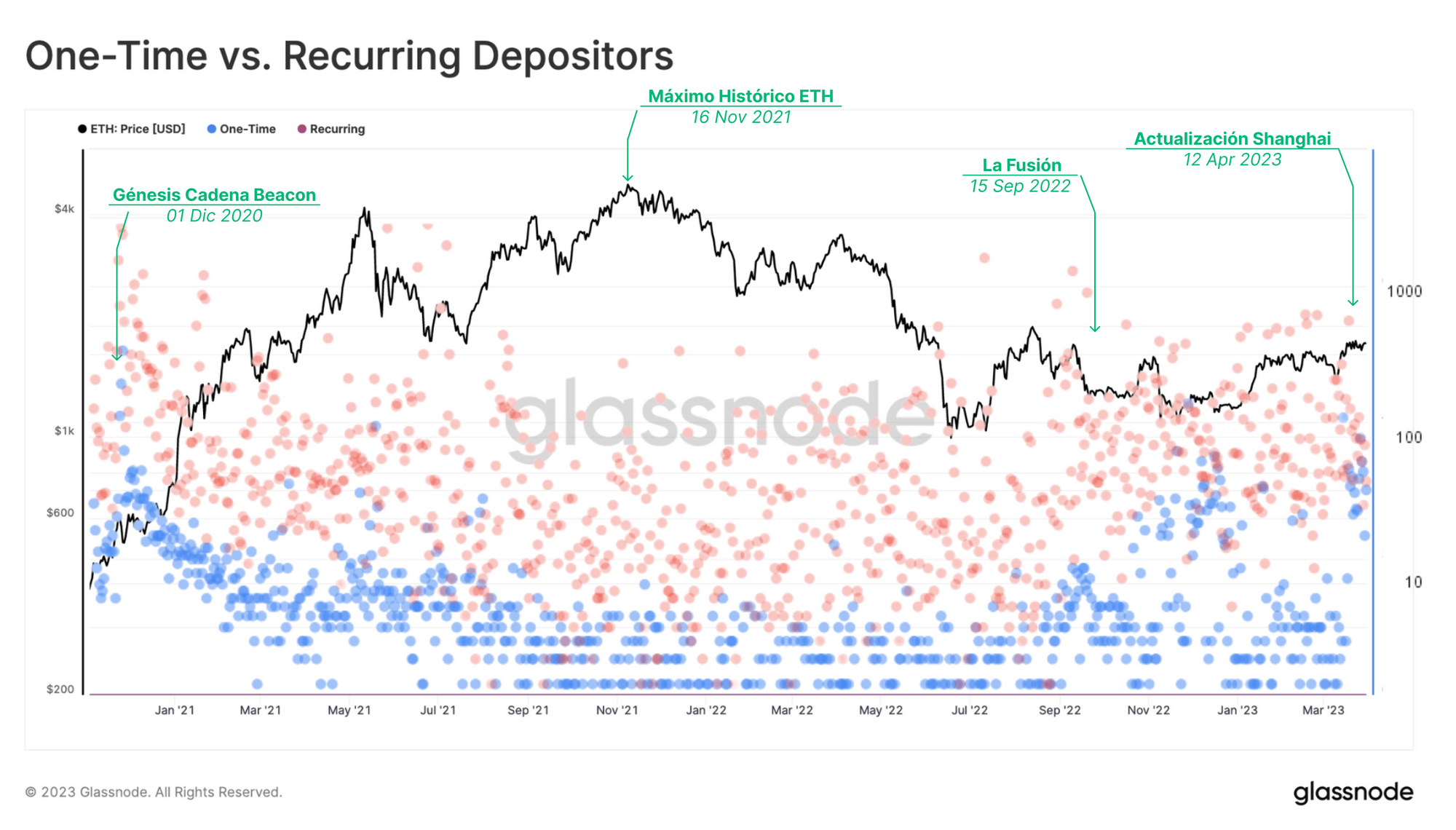 Hay que recalcar que la reserva de staking está formada principalmente de depositantes que han efectuado múltiples depósitos 🔴 (utilizamos escala logarítmica) y por tanto son dueños de más de un validador. Se aprecia que estos depositantes recurrentes efectúan más de 1.000 depósitos diarios en total. Muy interesantemente, durante el mercado alcista del 2021, la Cadena Beacon registró valores más bien apagados en la cantidad de nuevos depositantes.