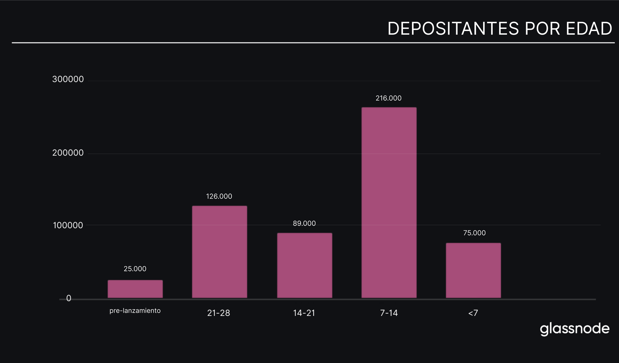 Además, vemos que la mayoría de depositantes tienen entre seis meses y un año de edad. Es indicativo de que la confianza en la economía de staking de Ethereum ha crecido a lo largo del último año, especialmente tras el éxito de la Fusión y las posibilidad de efectuar retiros a corto plazo.