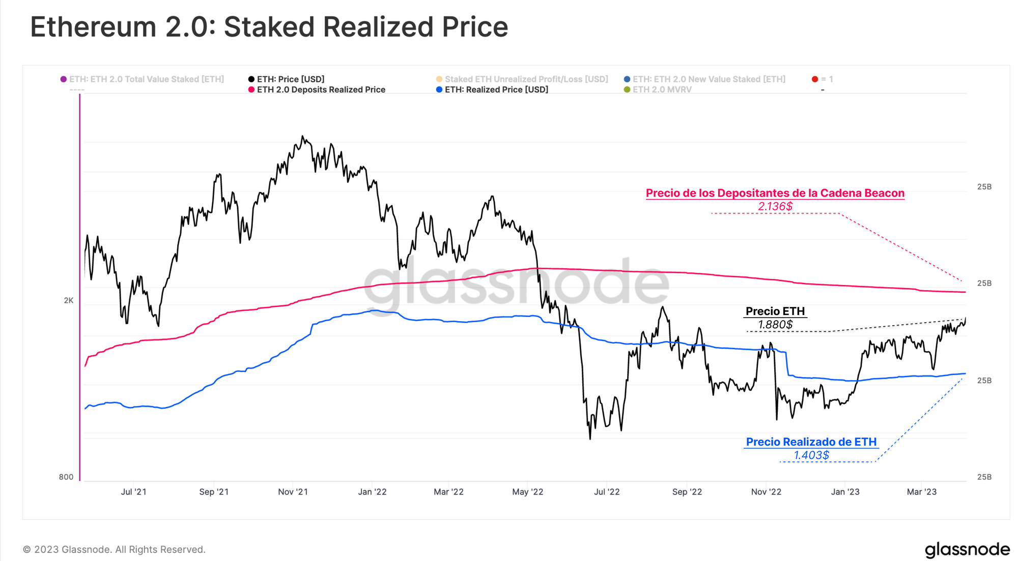 Actualmente, el precio medio de depósito 🔴 entre todo el ETH en staking ronda los 2.136$, lo que quiere decir que la pérdida no realizada media gira en torno al -13% del precio sport actual. En cambio, el precio realizado del network de Ethereum 🔵, que refleja el precio medio al que la oferta completa de ETH se desplazó por última vez, es de 1,403$, lo que supone en estos momentos un +36% de ganancias no realizadas.