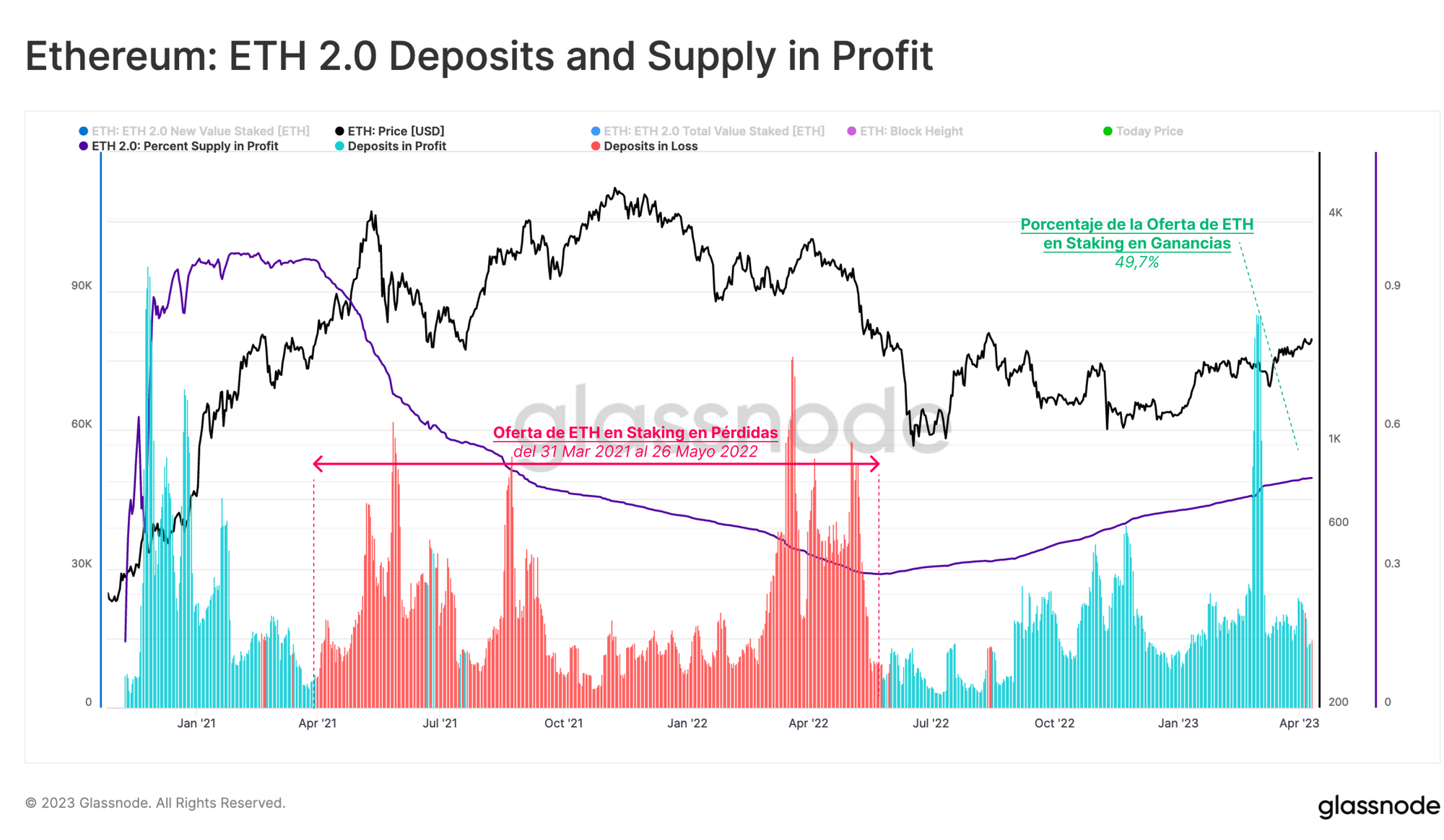 Si el precio del ETH en staking en el momento del depósito está por debajo del precio de mercado de ETH de hoy en día, consideramos que el stake está en pérdidas. No es de extrañar que la oferta de ETH depositada durante la cumbre del mercado alcista entre mediados del 2021 y mediados del 2022 esté soportando pérdidas no realizadas. Aproximadamente hasta la mitad de la cantidad total en staking está en pérdidas, información importante para estimar las dinámicas de retiro que pueden sucederse ahora que Shanghai ya está aquí.