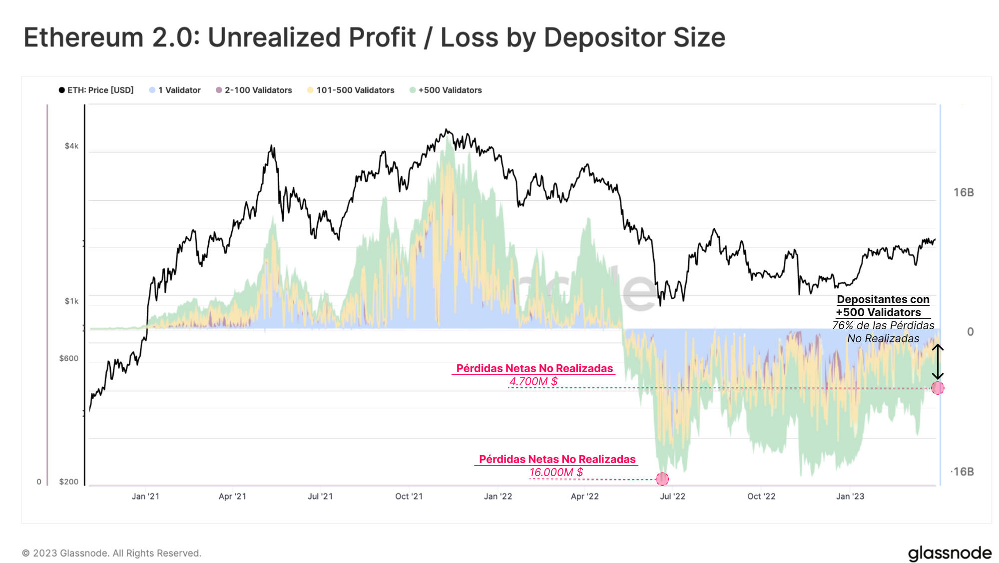 Sacando la diferencia entre el Precio Spot de ETH y el Precio Realizado del ETH depositado, deducimos la magnitud en dólares americanos de las ganancias o pérdidas no realizadas que los stakers tienen entre manos. Al dividirlo por tamaños de depositante, podemos hacer grupos en base a las pérdidas o ganancias de los diferentes tipos de depositantes. Tras alcanzar el pico máximo de pérdidas no realizadas de 16.000M $ que tuvimos en julio del 2022, las pérdidas no realizadas suman en estos momentos 4.700M $. Son perdidas que acarrean principalmente los depositantes de porte Ballena, quienes acaparan el 76% de todas las pérdidas no realizadas.