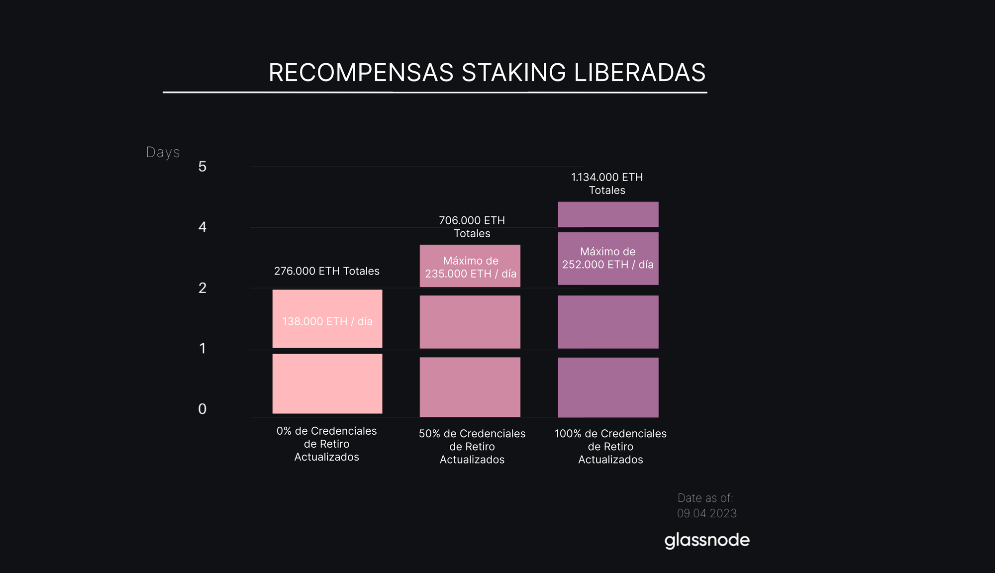 La siguiente gráfica muestra el monto mínimo y máximo de recompensas a pagar, incluyendo la cantidad diaria de ETH que se desbloquearía en cada caso. Finalmente los valores estarán en algún punto intermedio entre estos dos valores extremos. Creemos que muchos depositantes han esperado para actualizar sus credenciales hasta que se implementara con éxito la actualización Shanghai y desbloquear sus recompensas acumuladas, por tanto estableceremos el baremo en un 50% de retiros. Así pues, esperamos que la cantidad real de recompensas staking desbloqueadas se acerque más a los valores mínimos del rango, en torno a los 706.000 ETH (1.310M $).