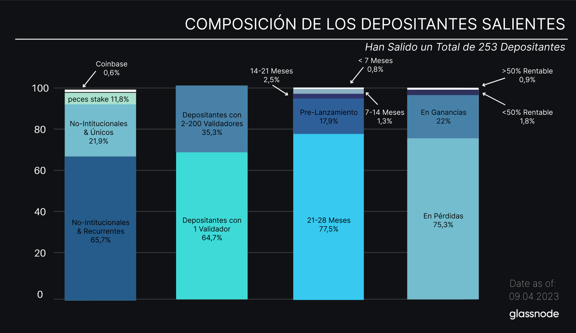 Observamos además que los depositantes que más salen del network son aquellos que sólo controlan un validador y aquellos que depositaron su stake en la fase anterior al lanzamiento de la Cadena Beacon, o durante el primer trimestre de su existencia. Temporalmente coincide con los inicios de la carrera alcista, por ello vemos precisamente esa gran cantidad de depositantes en pérdidas no realizadas.